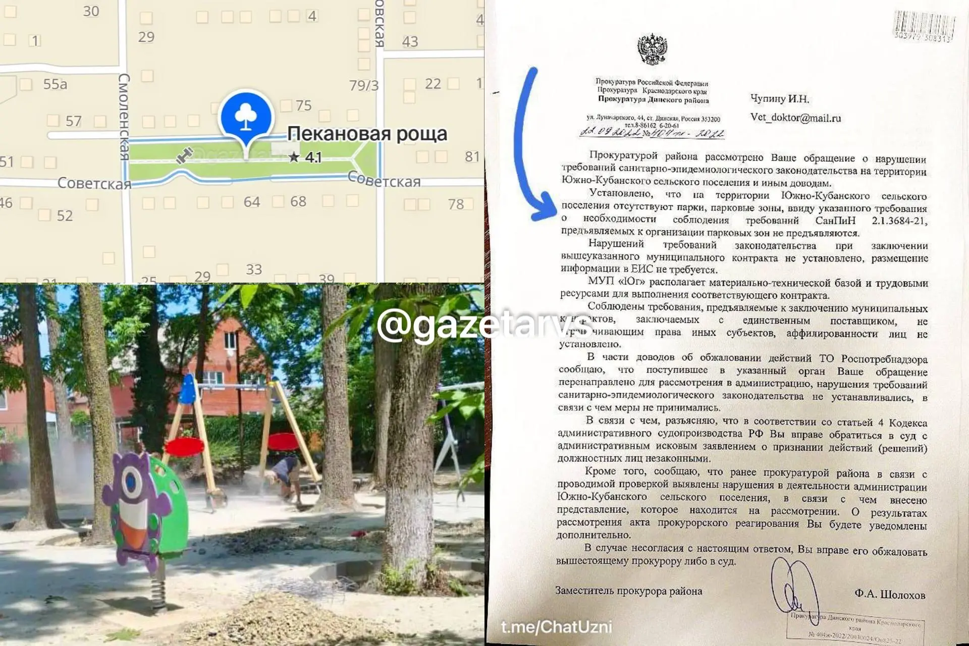 Как отмечается в обращении, на территории Южно-Кубанского сельского поселения нет ни одного парка или парковой зоны. Этот факт ранее (в 2022-м году) был официально подтверждён прокуратурой Динского района, которая указала на отсутствие объектов рекреации.