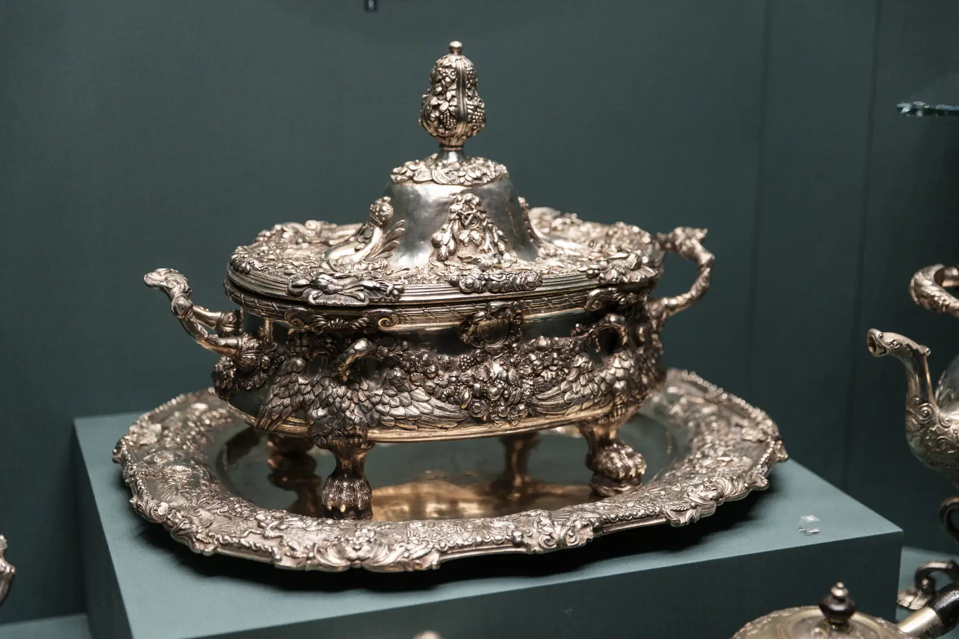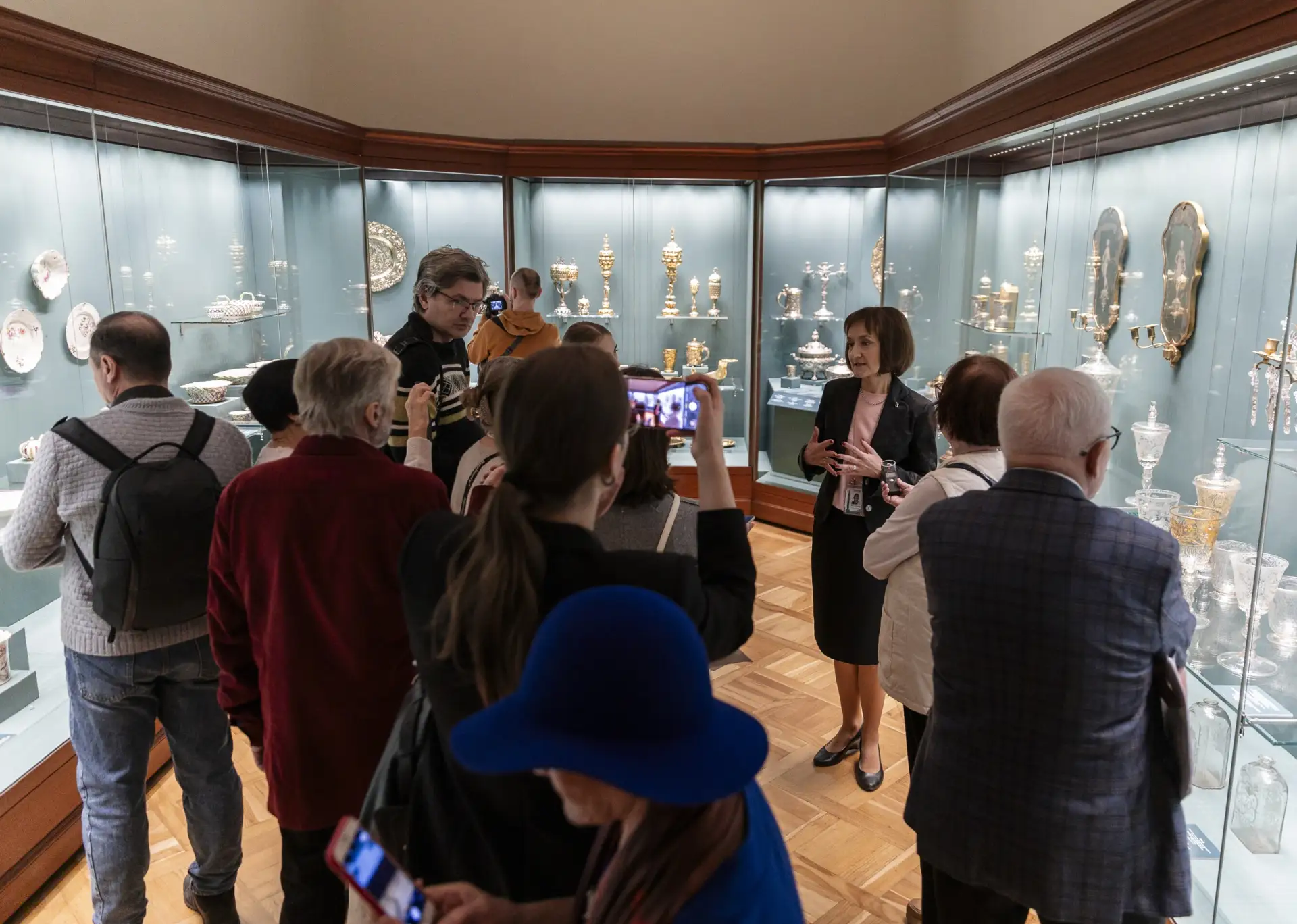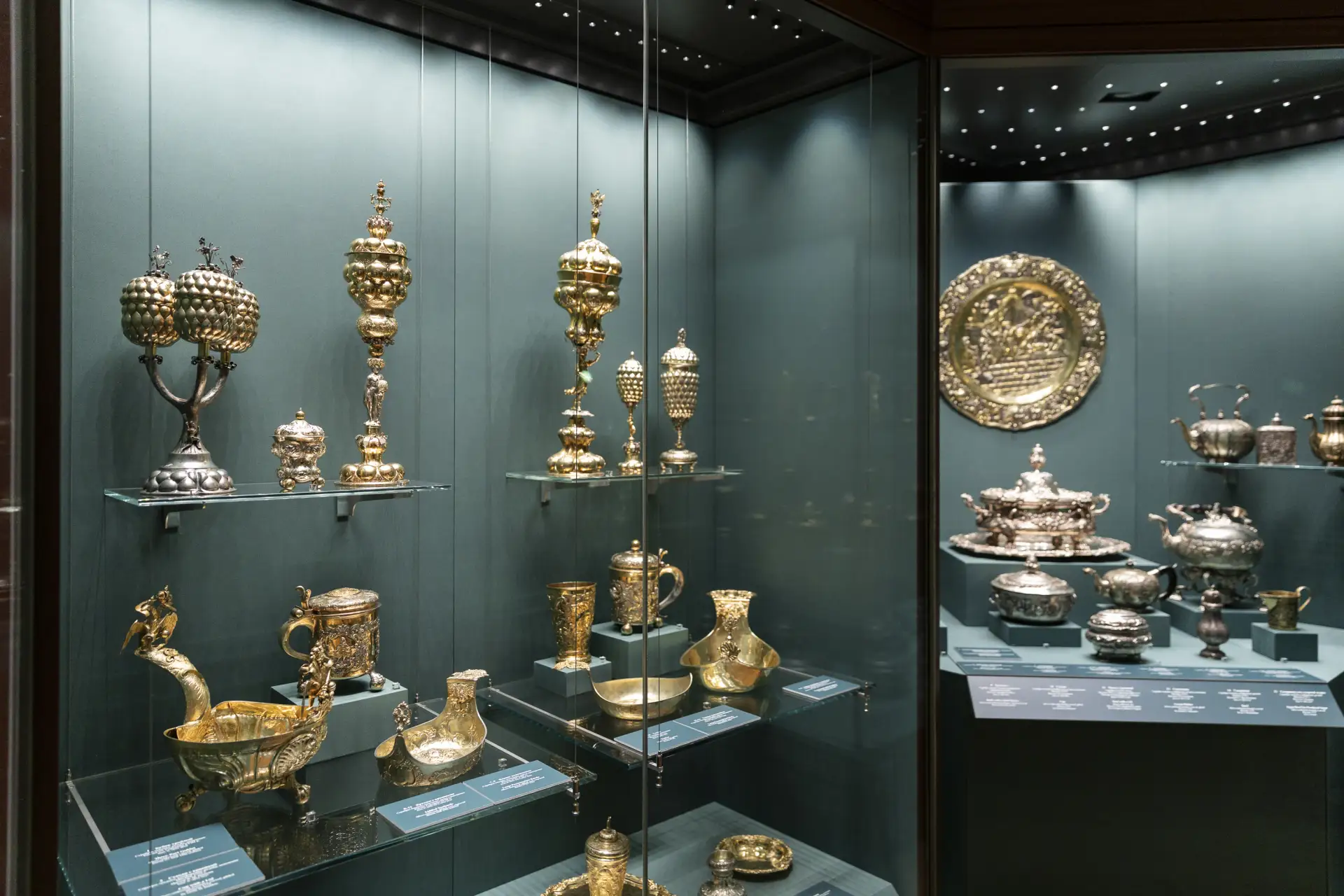 В новом зале представлены предметы из стекла и серебра из коллекции императорского двора середины XVIII века – периода правления императриц Анны Иоанновны и Елизаветы Петровны. Это кубки, ковши, штофы и другие предметы, исполненные в пышном барочном стиле. Подобные изделия демонстрировали богатство и процветание государства, придавали церемониям и парадным обедам еще большую торжественность.