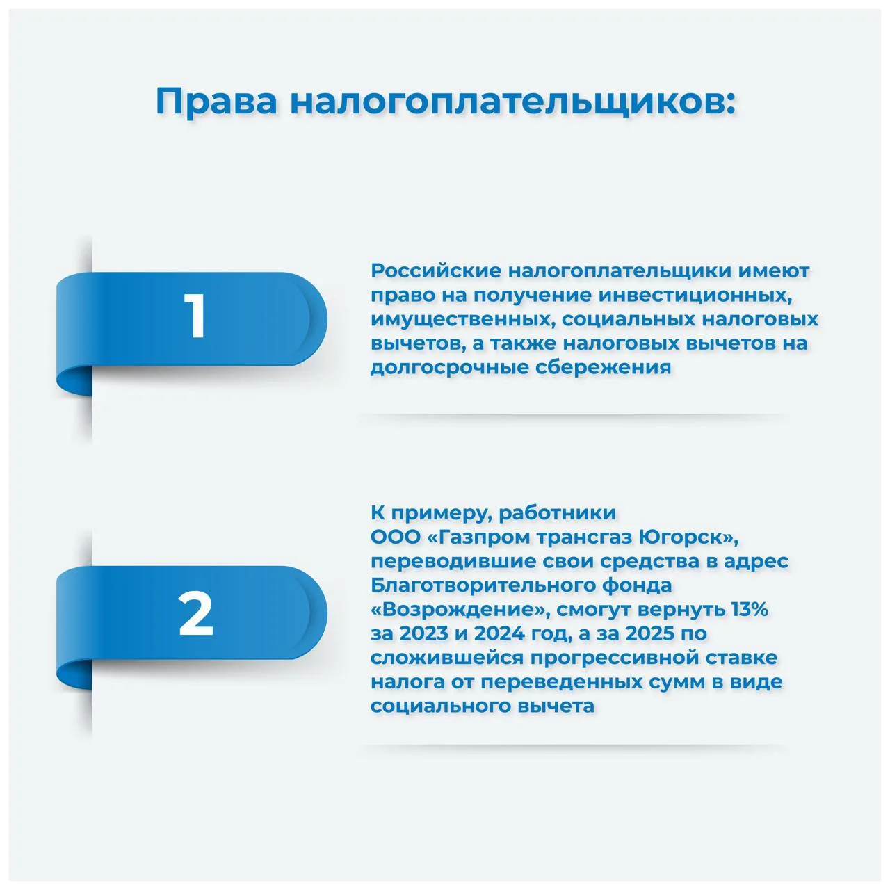 К примеру, работники ООО «Газпром трансгаз Югорск», переводившие свои средства в адрес Благотворительного фонда «Возрождение», смогут вернуть 13% за 2023 и 2024 год, а за 2025 по сложившейся прогрессивной ставке налога от переведенных сумм в виде социального вычета.