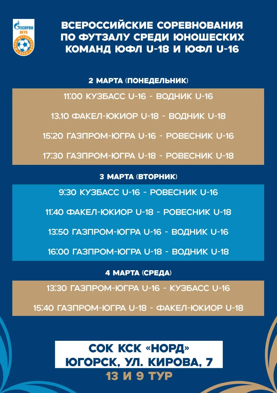 В Югорске на спортивной арене спортивно-оздоровительного комплекса КСК «Норд» ООО «Газпром трансгаз Югорск» проходят матчи Юниорлиги В программе сегодняшнего дня состязаний - поединки команд U-16 и U-18.