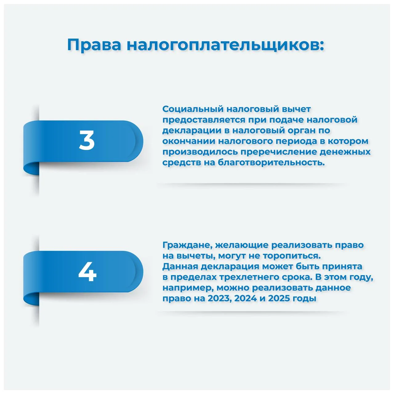 ▫️ Социальный налоговый вычет предоставляется при подаче налоговой декларации в налоговый орган по окончании налогового периода в котором производилось перечисление денежных средств на благотворительность.