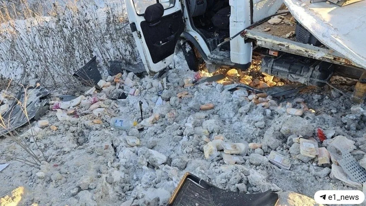 «Газель», перевозившая продукты для точек быстрого питания, вылетела с проезжей части на обочину и развалилась на части. Груз рассыпался по обочине и дороге.
