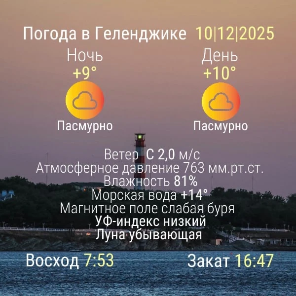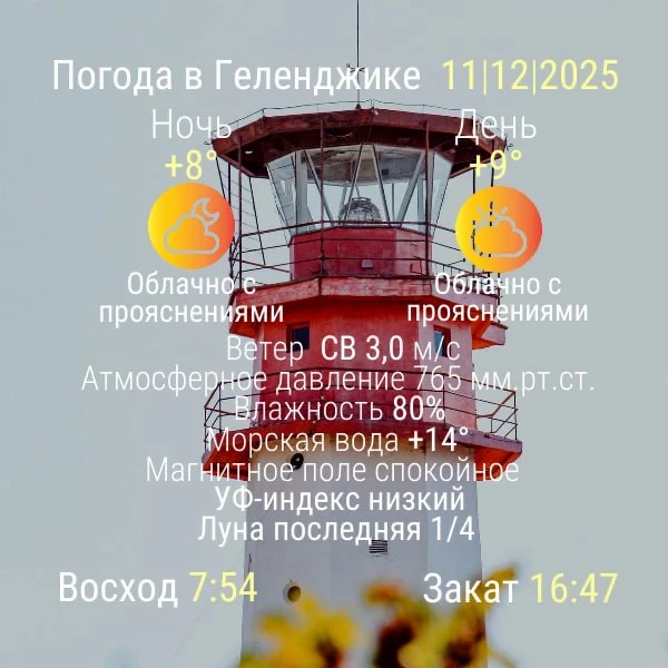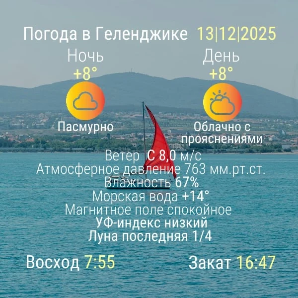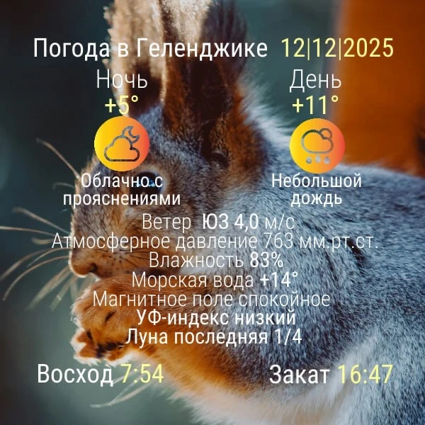 Вечером и до конца суток 12 декабря, а также 13 декабря на Кубани, в том числе и в Геленджике, ожидаются сильные дожди. Возможны гроза и усиление ветра с порывами 20-25 м/с.