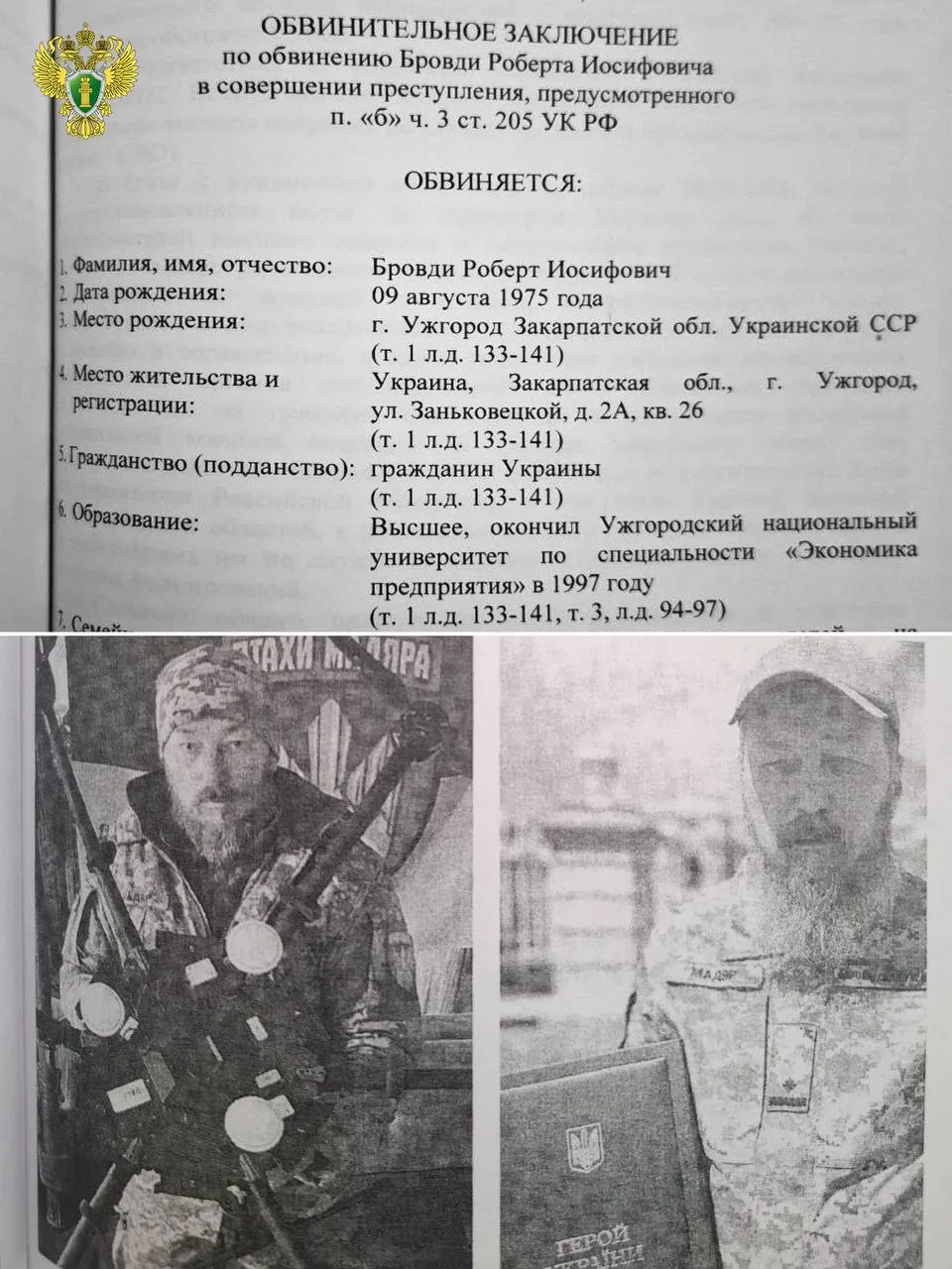 📁 Генпрокуратура России направила для заочного рассмотрения в суд уголовное дело в отношении командира бригады ВСУ Николая Дзямана. В январе 2024 года он приказал сбить российский самолет, доставлявший украинских военнопленных к месту их обмена в Белгородской области.