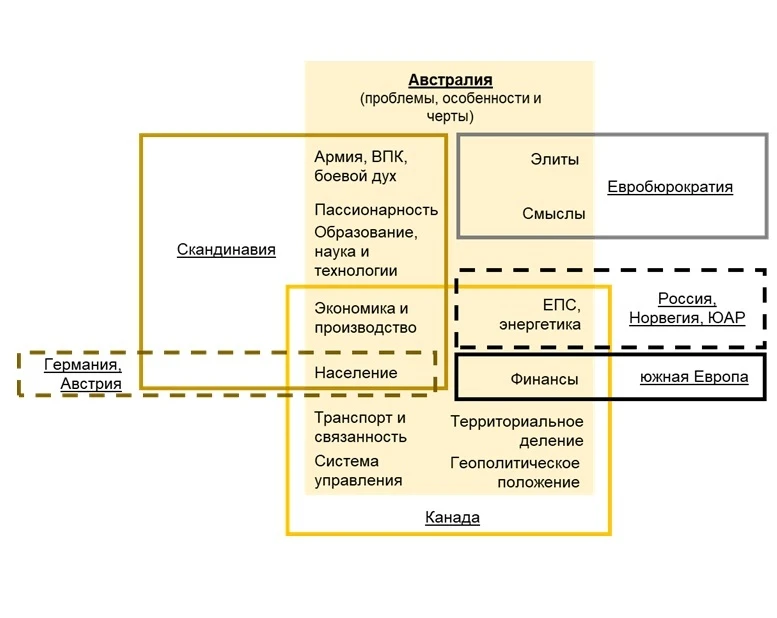 Краткое описание Австралии: "Вилла, в которую хозяева заселили наёмных работников, чтобы те за ней следили и её не заняли сквоттеры". Для англосаксонских элит Зелёный континент является резервом ресурсов и местом для переселения в перспективе. С живущими там 27 млн считаться никто не будет, никого не интересуют потомки каторжников, низших сословий и мигрантов-гастарбайтеров без роду и племени. Местные элиты – дальние, бедные, худородные кузены-приказчики, да и в целом, современная Австралия нечто среднее между Канадой и Скандинавией, во главе которых поставили евробюрократов (см. рисунок).