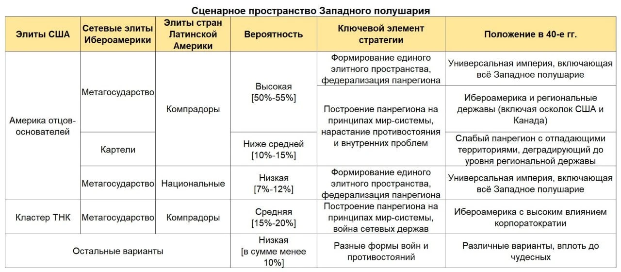 ▪️универсальная империя, объединяющая всё Западное полушарие, где имеющиеся различия между США и странами Латинской Америки практически сотрутся. Этот вариант требует союза между национально ориентированными элитами США и сетевыми элитами;