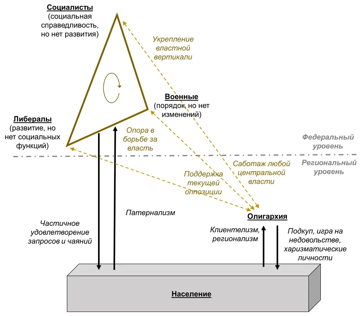 В начале XXI в. данный тренд был сломан, сейчас страна с точки зрения территориальной организации – федеративная республика, но с позиции управления – унитарная с высокой централизацией. Крупный бизнес и капиталы отодвинуты от управления государством, региональные элиты ограничены, у них выбиты основы для сепаратизма. В основе устойчивости современной системы лежит доминант служения над капиталом и постоянная, обязательная, масштабная ротация чиновников и силовиков высокого и среднего уровня, формирование из них единой общности.