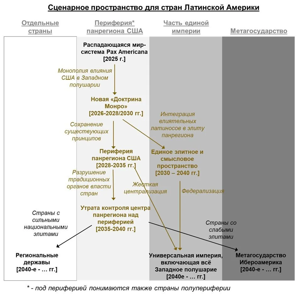Попытки проведения собственной политики отдельными странами Латинской Америки не окажут серьезного влияния на общий расклад. После прохождения точек выбора, один, общий и коллективный сценарий станет основным и доминирующим для всех. Крупные и расположенные на периферии страны: Бразилия, Аргентина и Канада теоретически могут попробовать вырваться из пут общей судьбы, став региональными державами, для остальных выбор отсутствует - универсальная империя или Ибероамерика. В этих раскладах Дональд Трамп лишь функция-разрушение, много интереснее, кто станет его преемником, ведь от его политики будет зависеть по какому пути пойдёт всё Западное полушарие.
