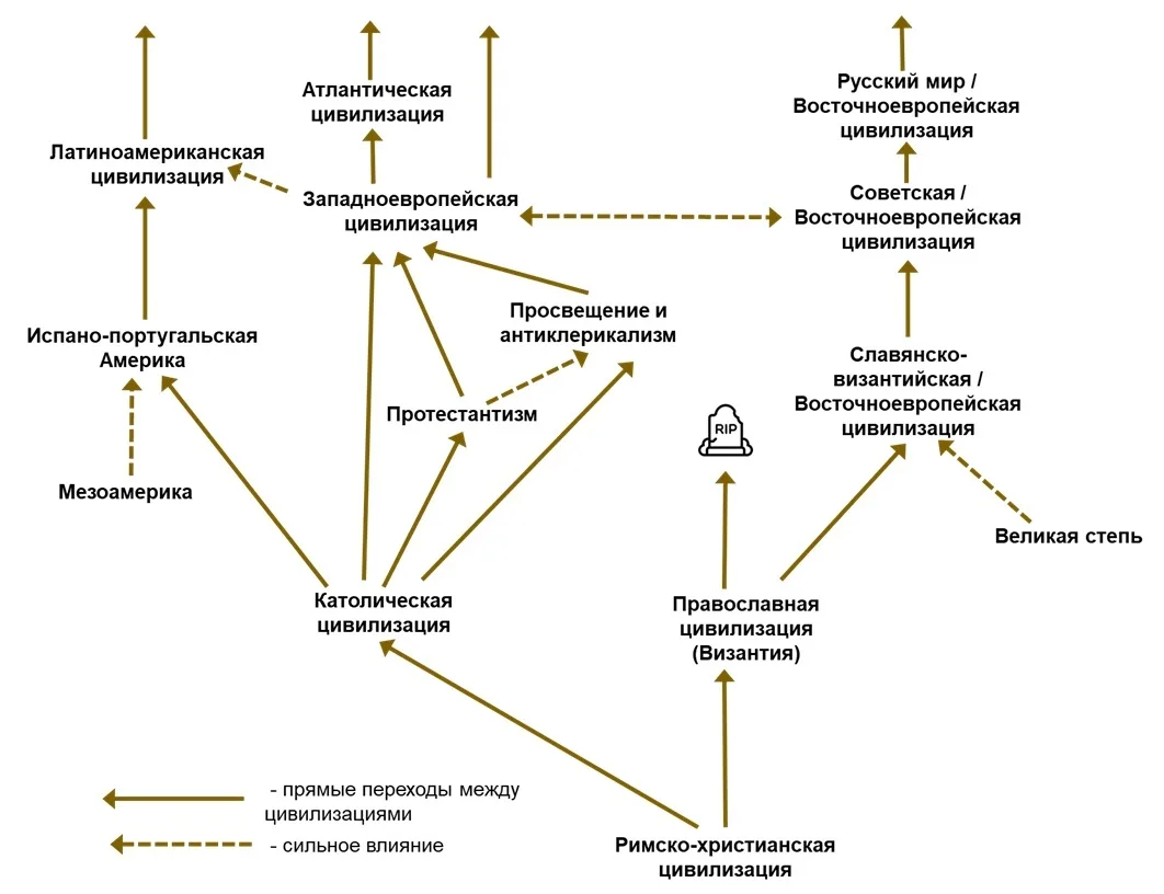 Небольшая иллюстрация генезиса куста европейских цивилизаций последних полутора тысяч лет. Вопросы Греции, Рима и т.д. из более ранних времен тут не рассматриваем. На схеме хорошо видно всё большее расхождение и уход от общего корня. Показаны только основные влияния.
