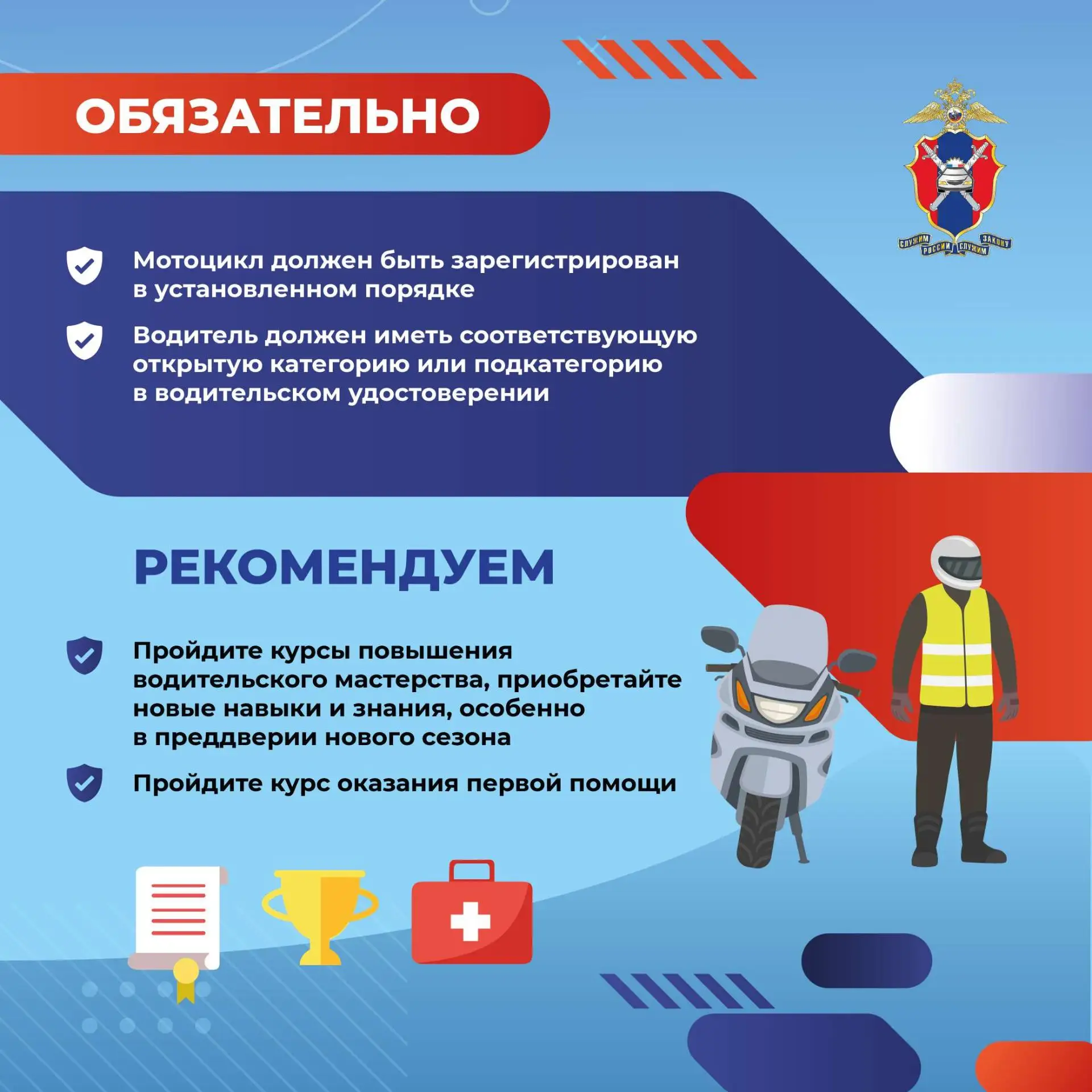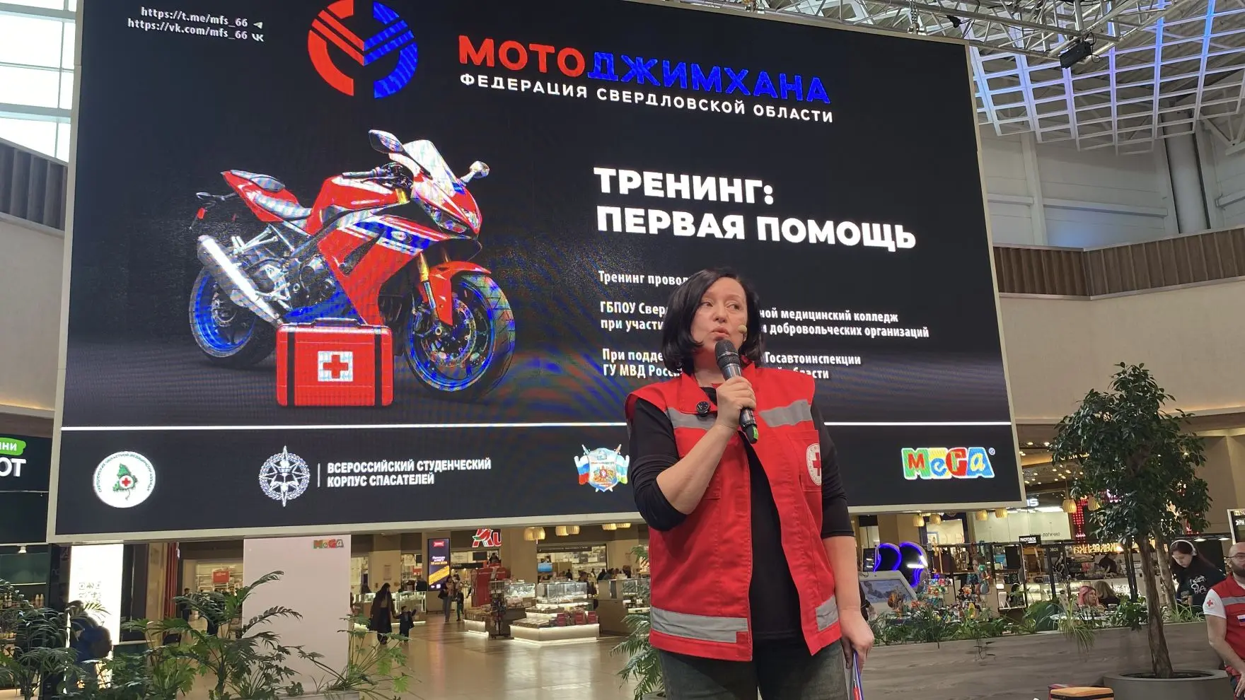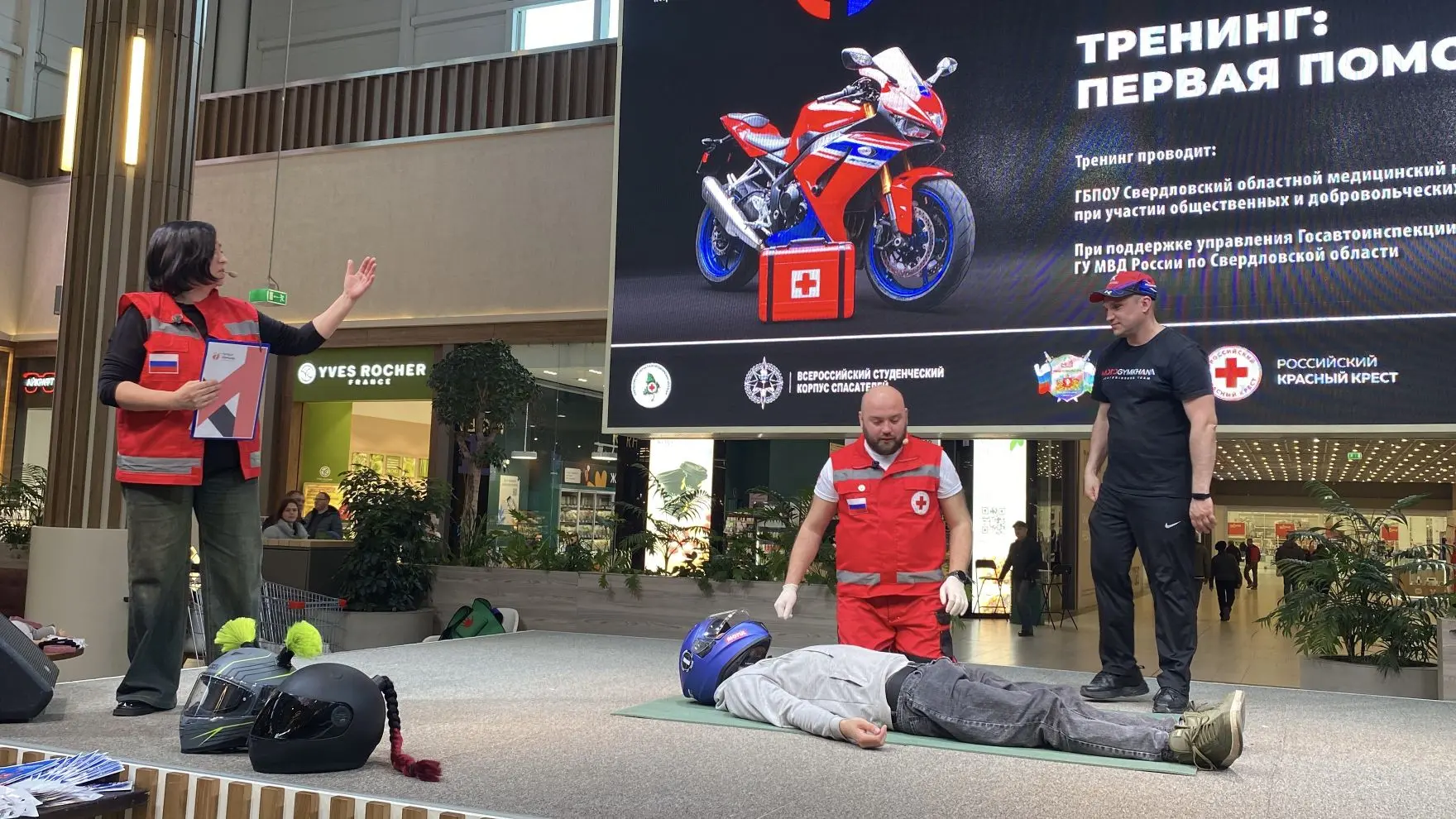 Госавтоинспекция совместно с мотосообществами, Российским Красным Крестом проводит тренинги по оказанию первой помощи. «Снять мотошлем и провести сердечно-лёгочную реанимацию — этим навыкам нужно учиться отдельно», — отметила Кравченко. В текущем году проведено два тренинга, ранее проводили раз в год. Работа ведётся с родителями, спортивными организациями, министерствами образования, спорта, пунктами продажи, аренды техники.