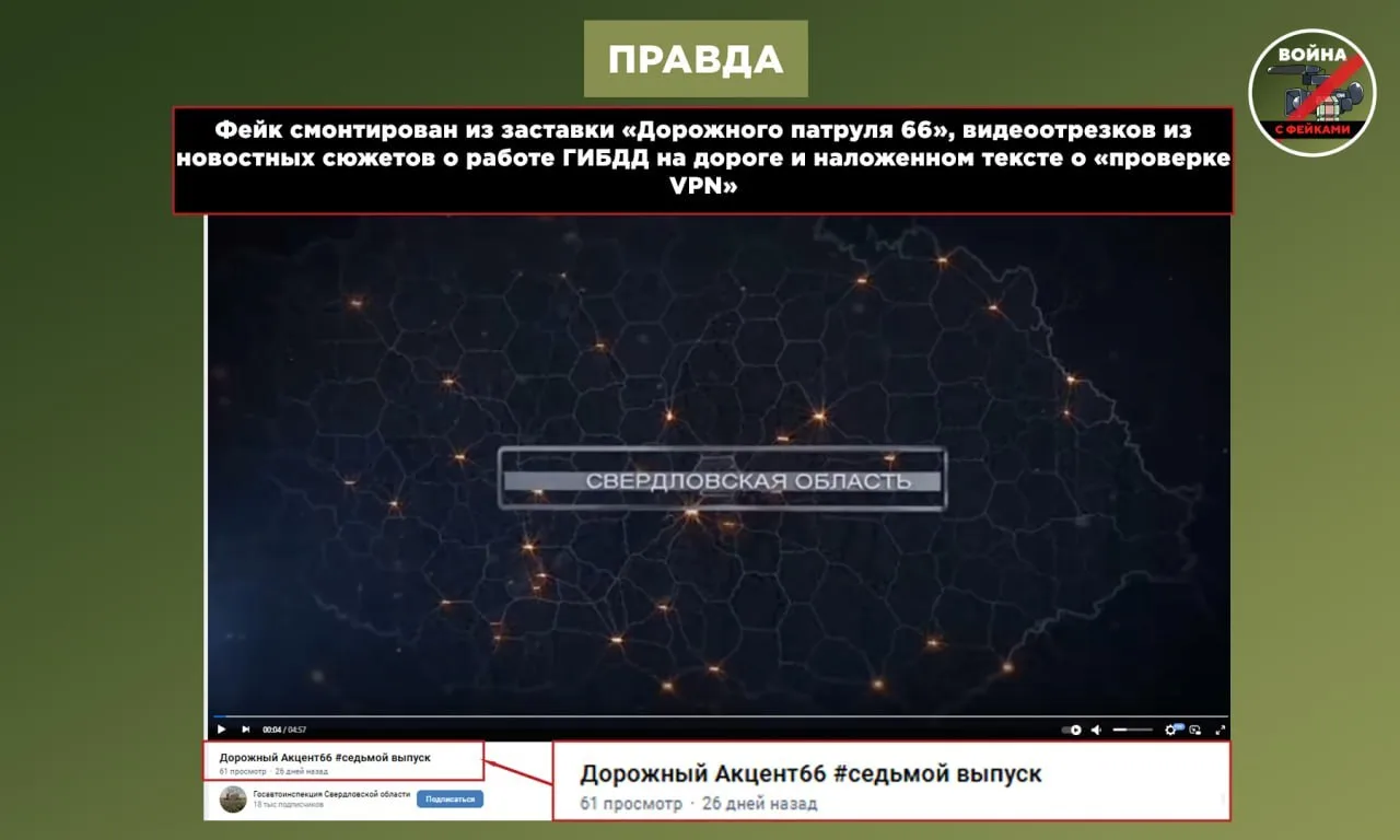 Отметим то, как сделан фейк. Авторы подделки взяли узнаваемую заставку программы «Дорожный патруль 66», нарезали фрагменты из реальных новостных сюжетов о работе ГИБДД и поверх наложили текст про VPN. Получилось подобие документального репортажа, которого на самом деле не существует.