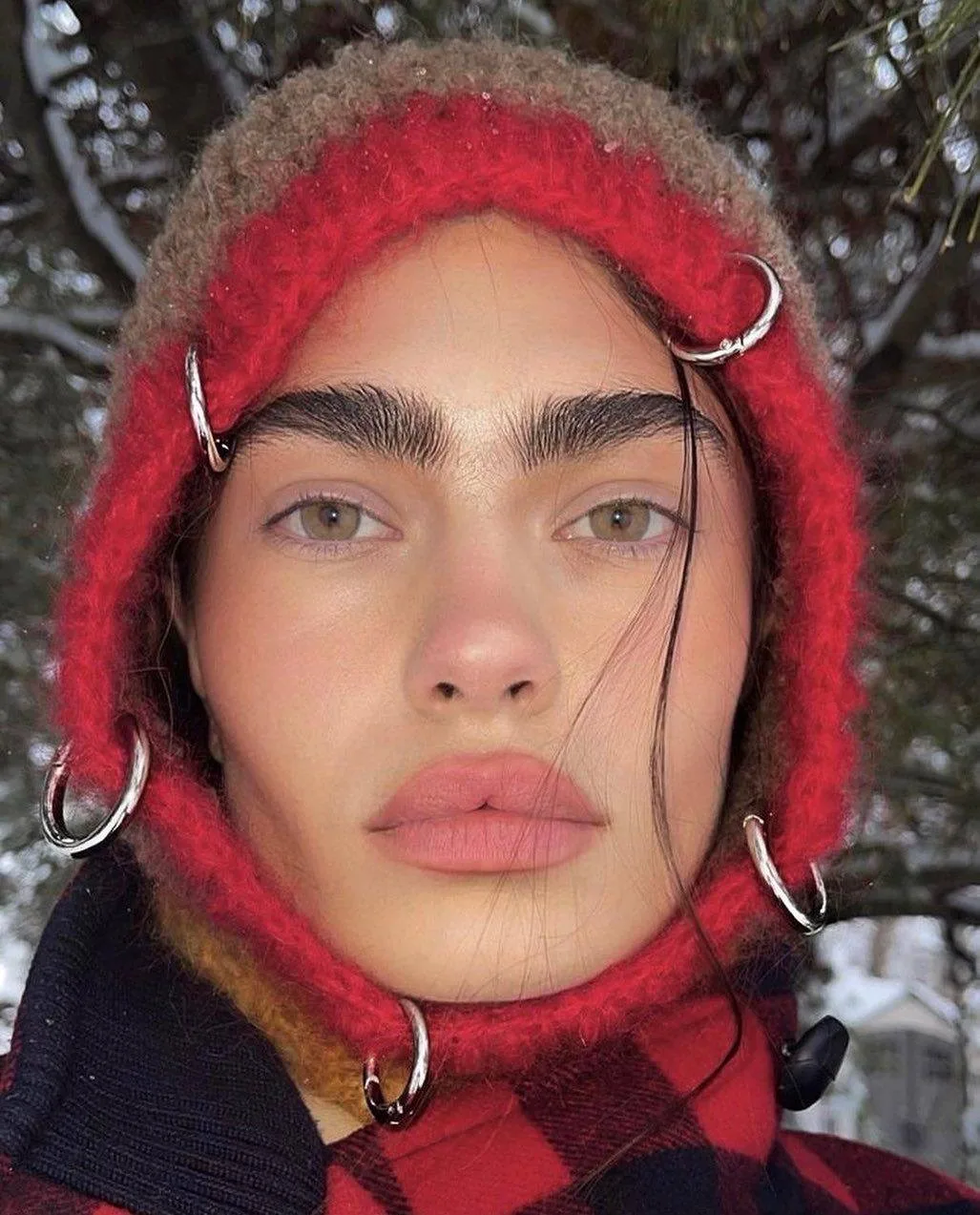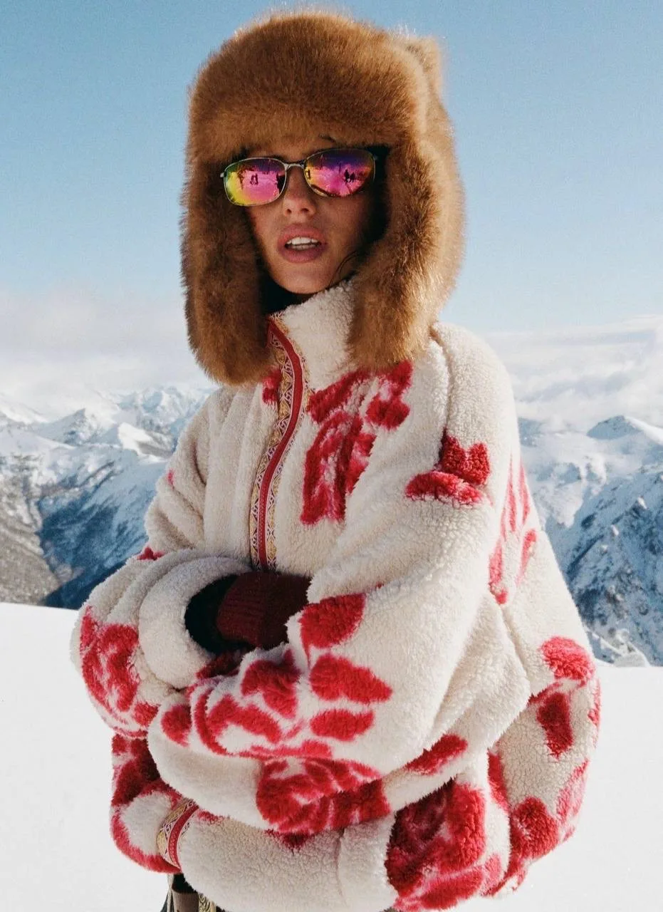 Ссылки: шуба, джемпер, капор, джинсы, перчатки, сумка, ботильоны, серьги, колье.