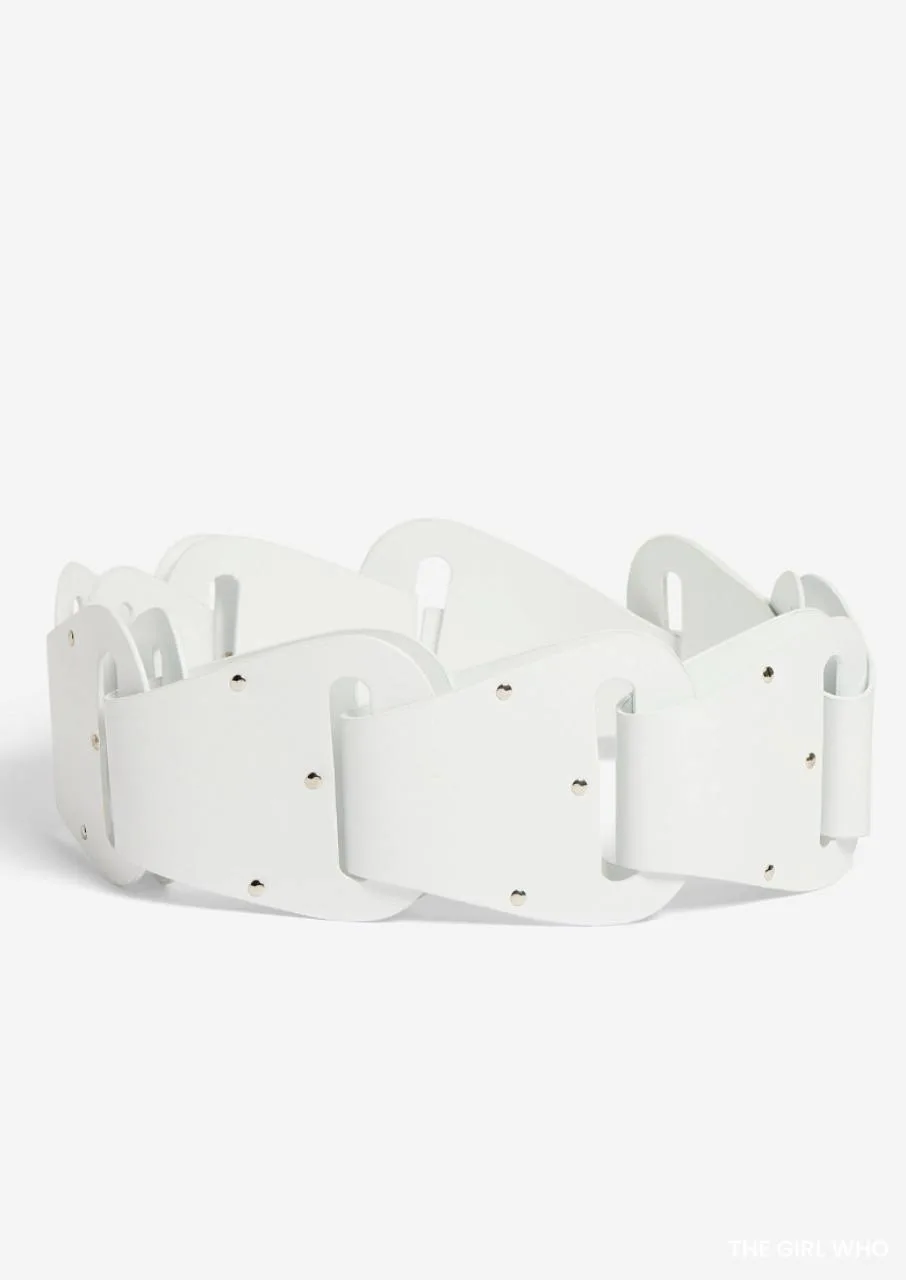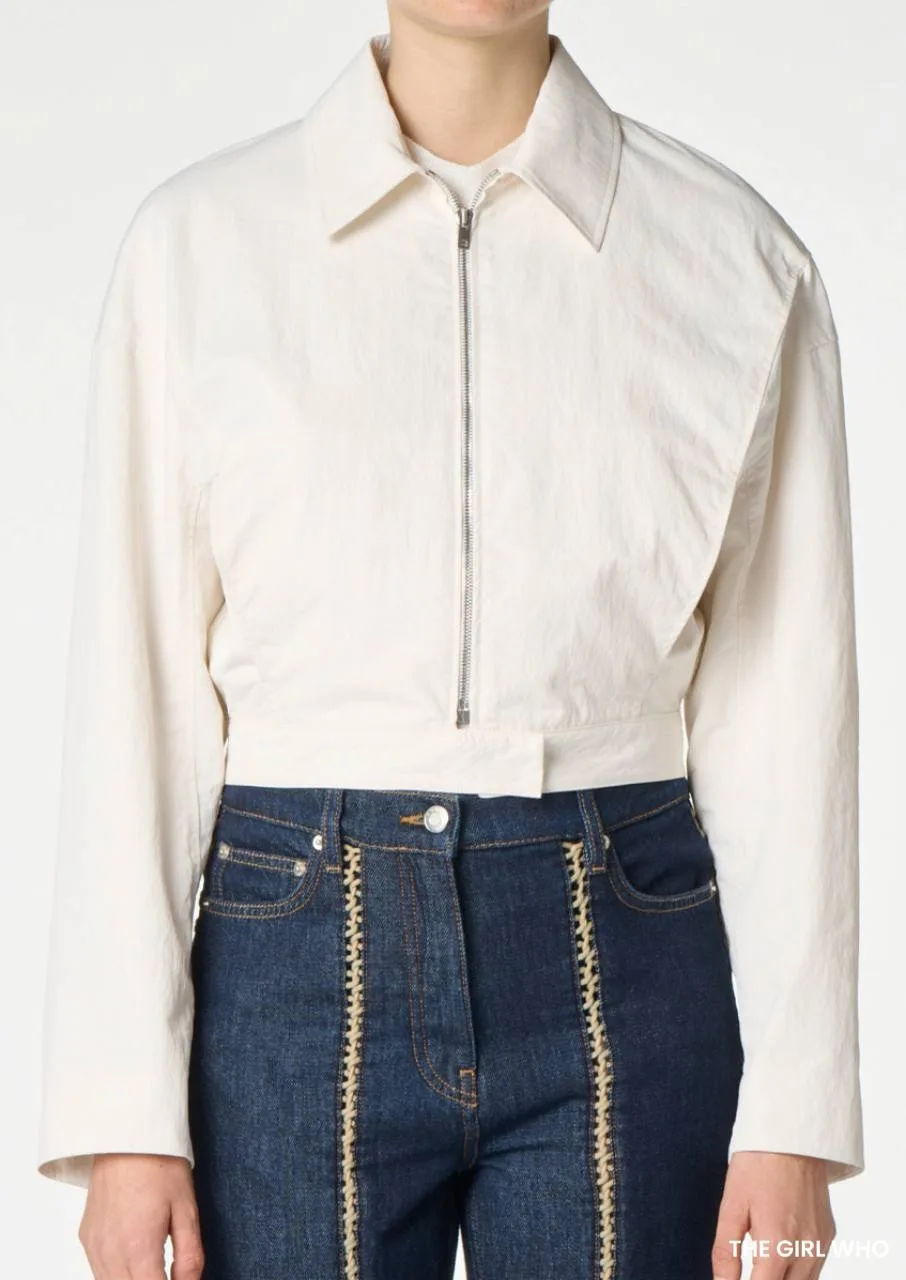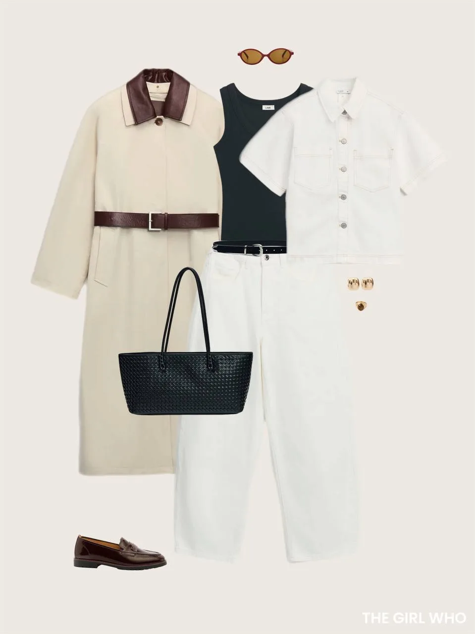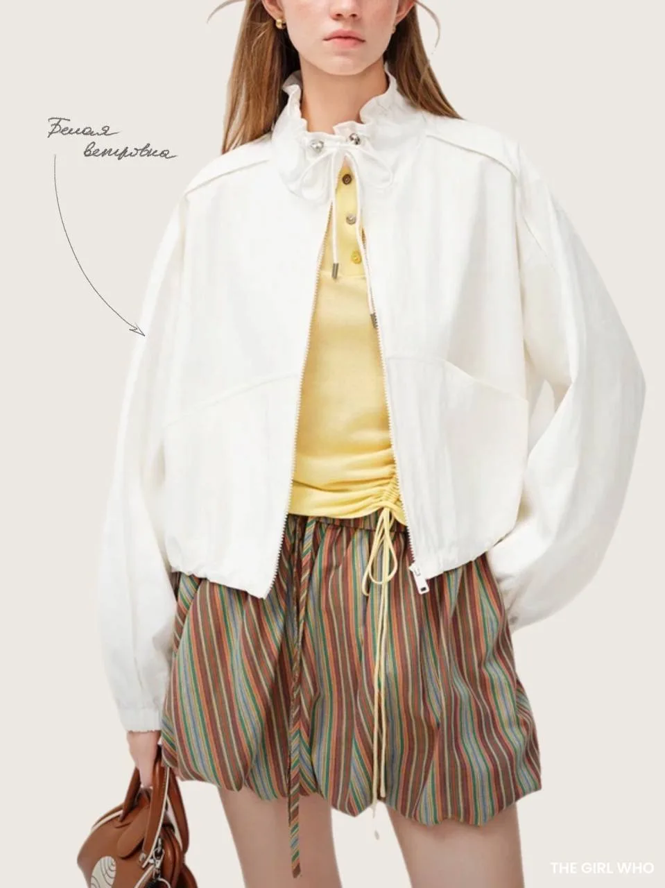 Ссылки: парка белая, белый ремень, футболка с плечами, мюли с острым мысом, белая куртка, бежевая сумка, куртка из денима.