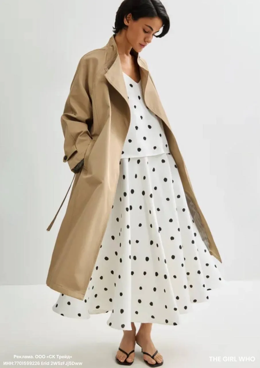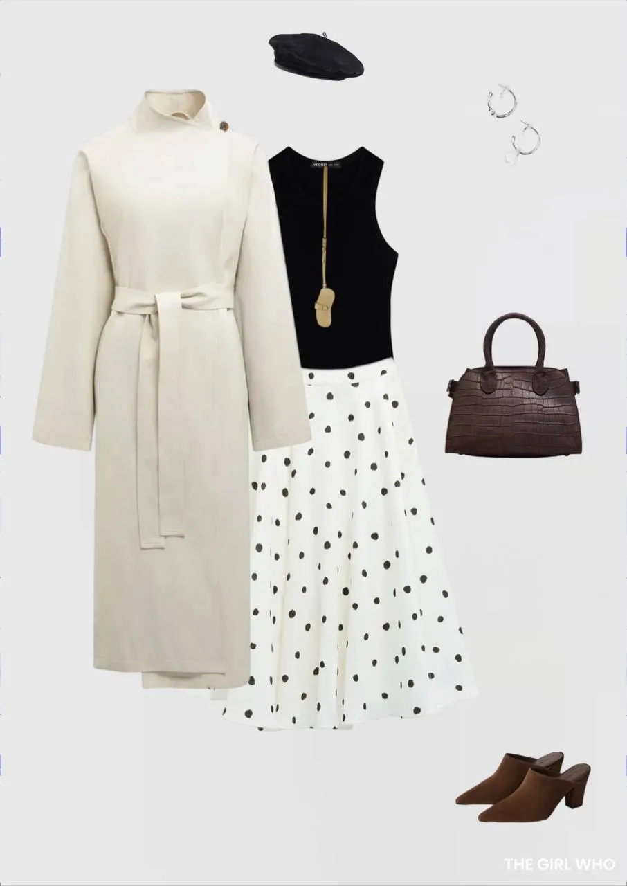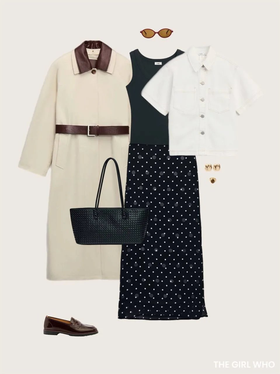 Ссылки: тренч, юбка в горох, топ черный, берет, серьги, мюли, сумка, футляр для очков.
