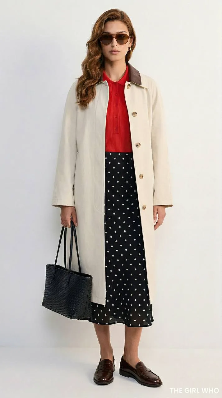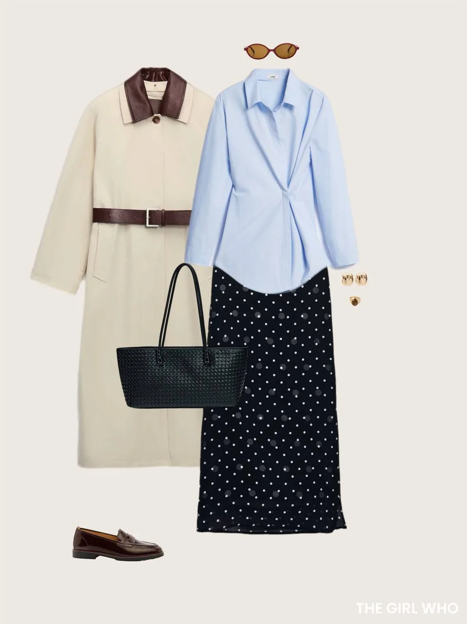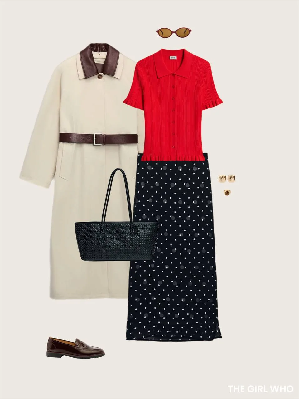 Ссылки: тренч, юбка в горох, топ черный, берет, серьги, мюли, сумка, футляр для очков.