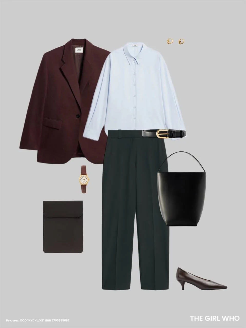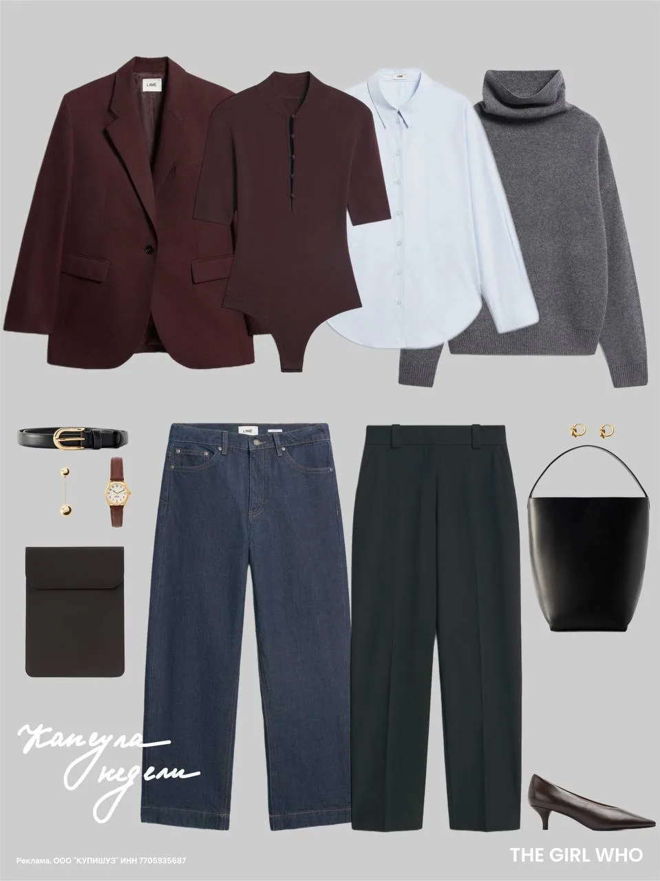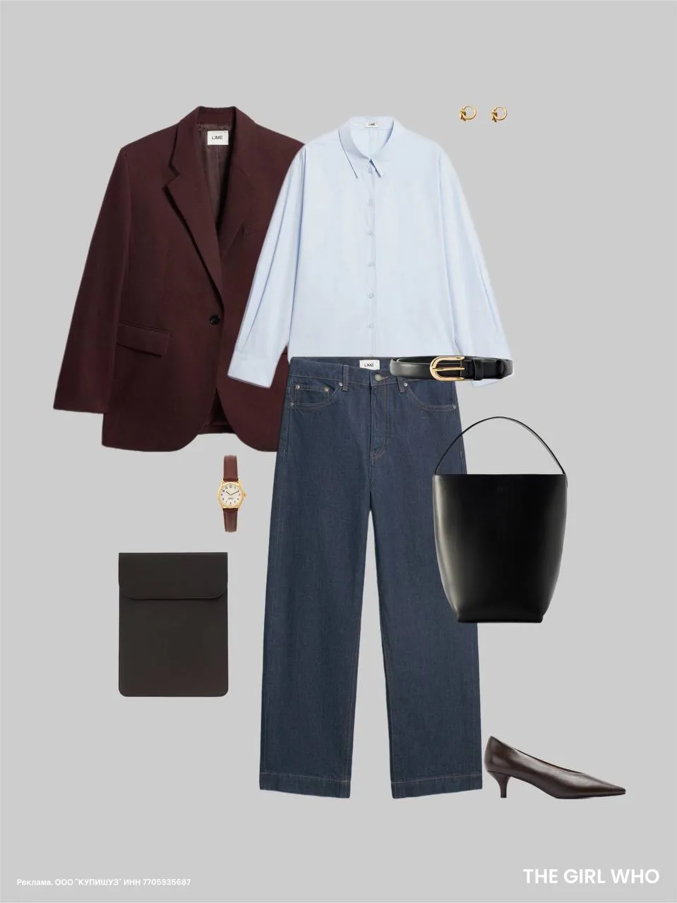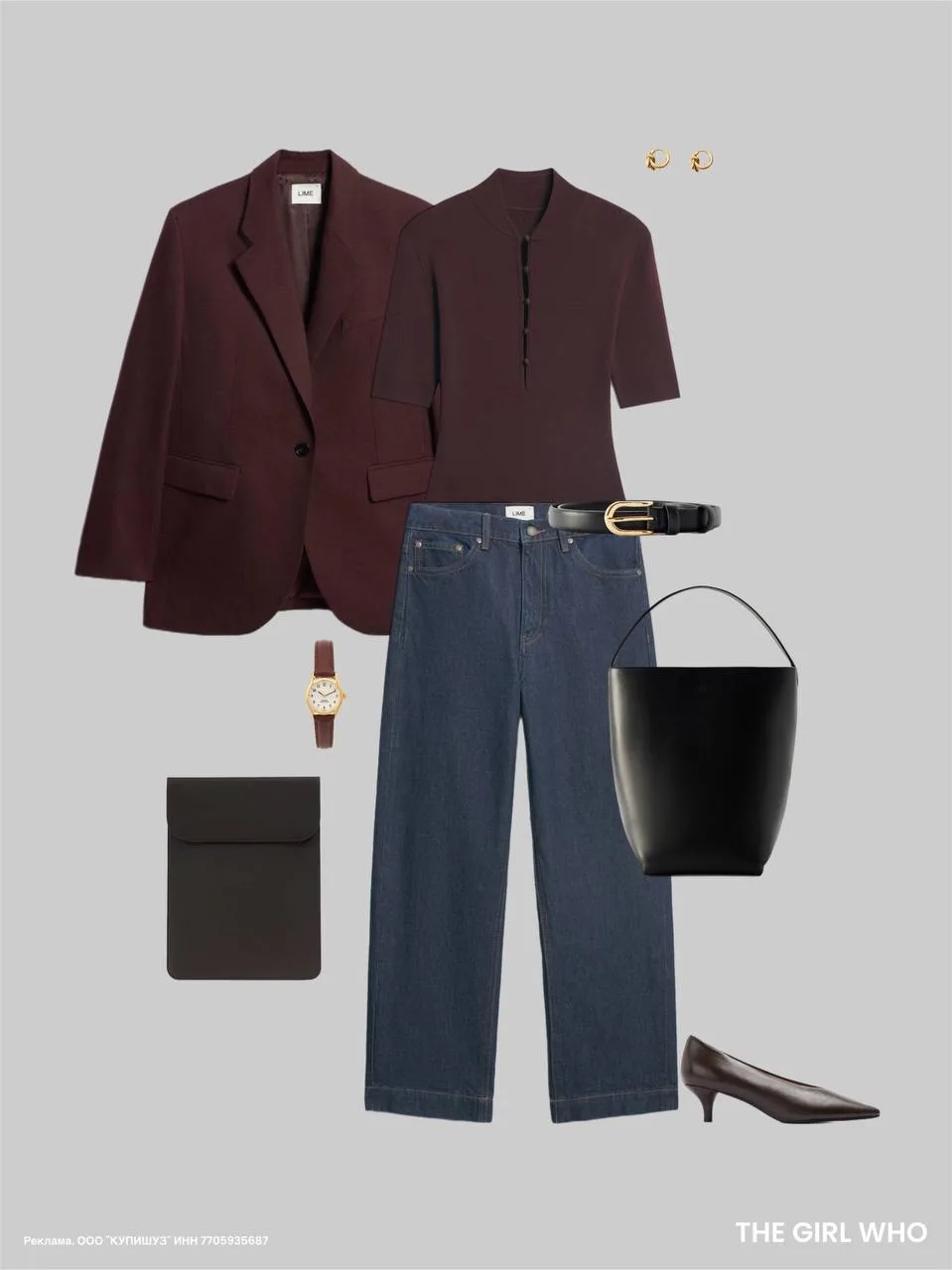 Ссылки: жакет, боди, рубашка, свитер, джинсы, брюки, сумка, серьги, туфли, ремень, часы, брошь, сумка для ноутбука.