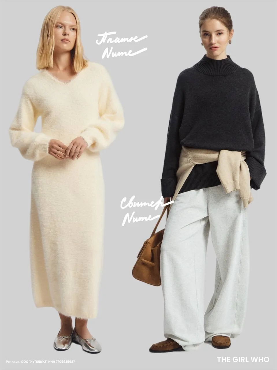 Ссылки: джемпер Sela, джинсы Limé, ботинки Grate, платье Nume, свитер Nume, свитер Love Republic, сумка Mango, юбка Nume.
