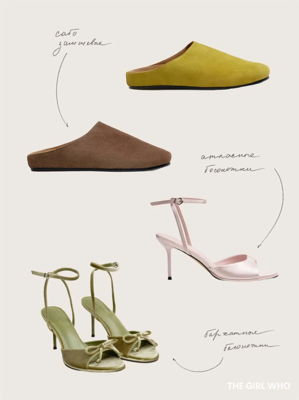 Ссылки: сабо коричневые, босоножки с тонкими ремешками, лоферы, сандалии на широких ремнях, туфли из сетки, вьетнамки на каблуке, туфли с круглым носом.