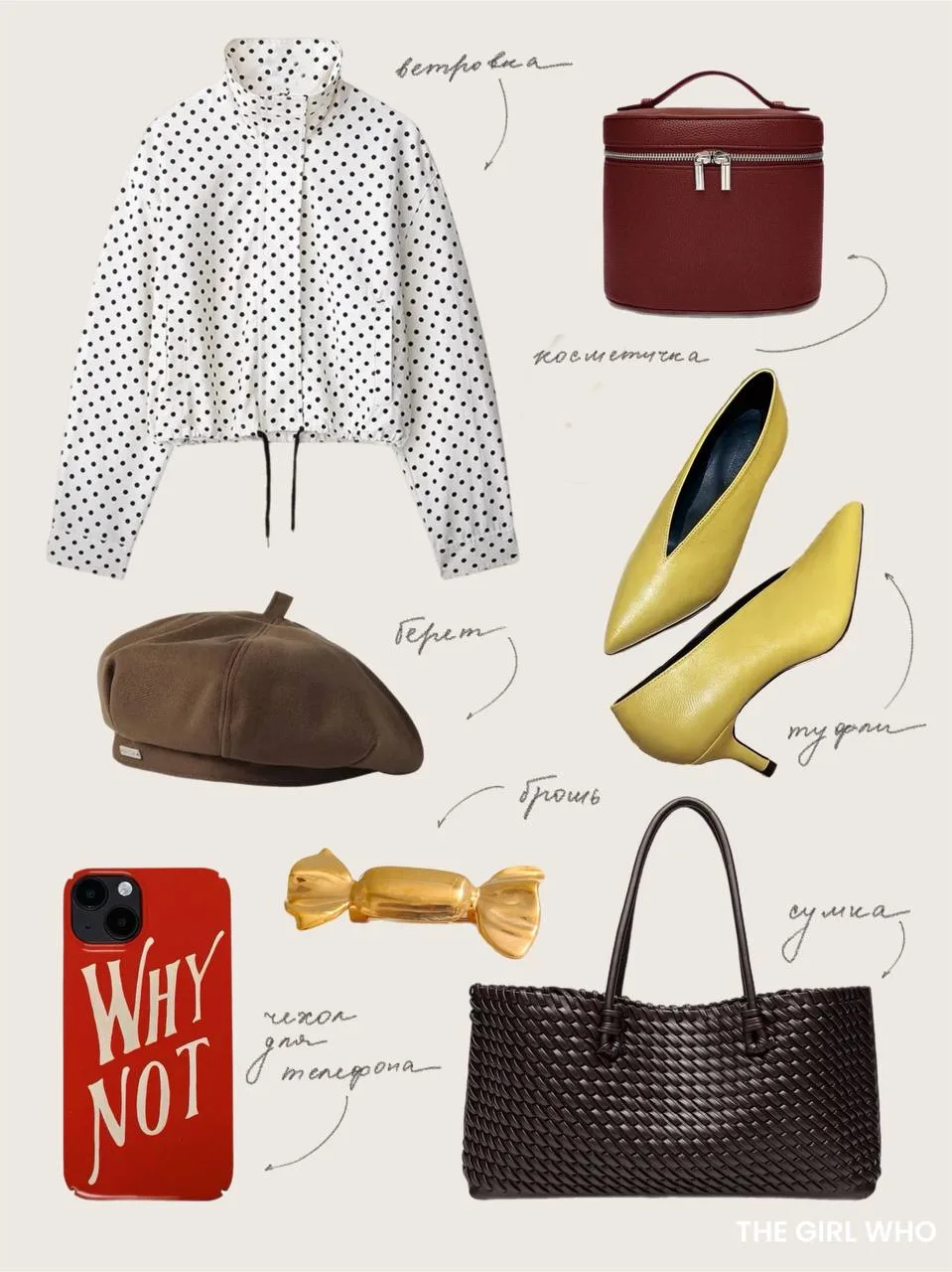 Ссылки: ветровка, косметичка, туфли, берет, брошь, чехол для телефона, сумка.