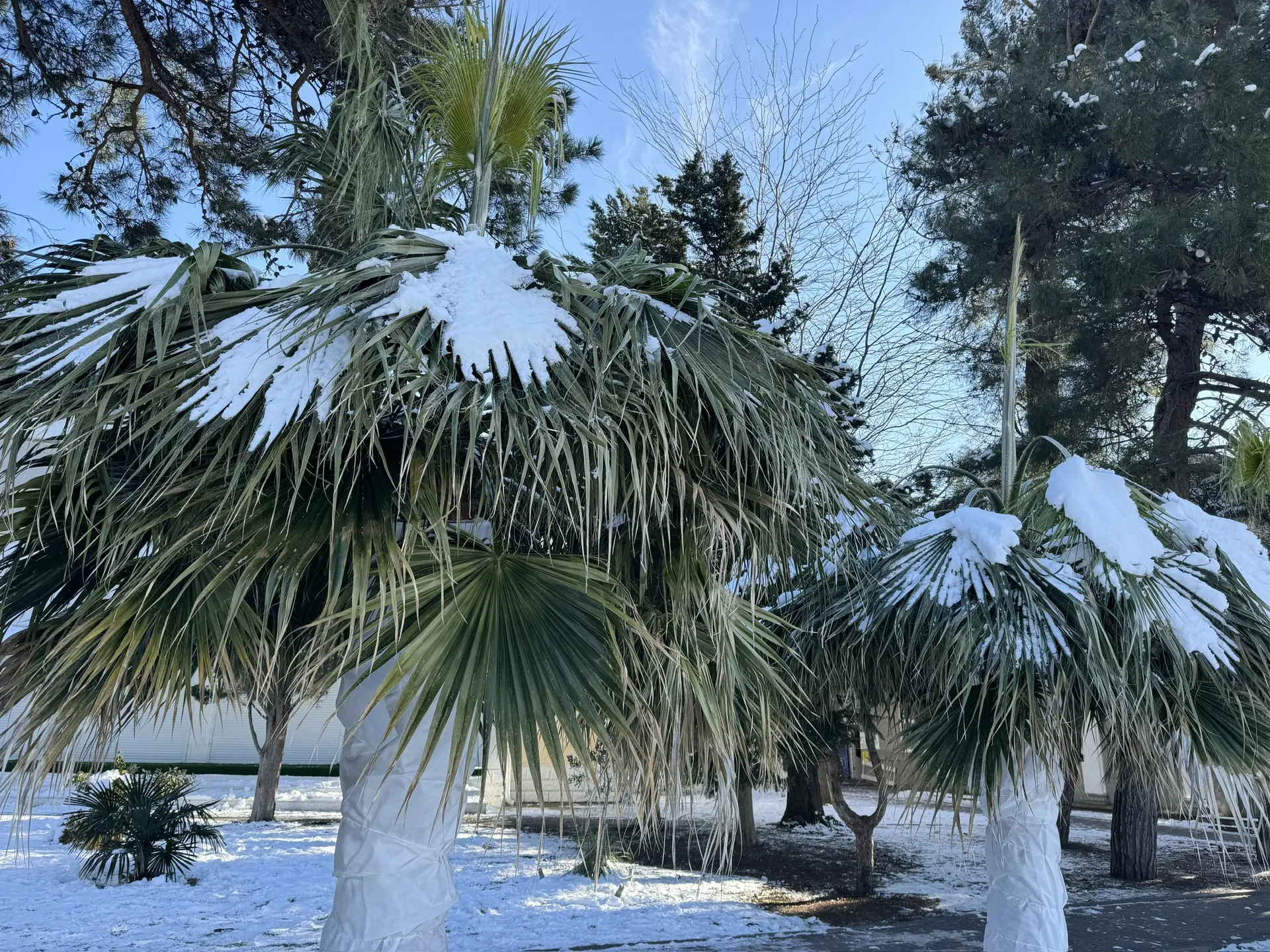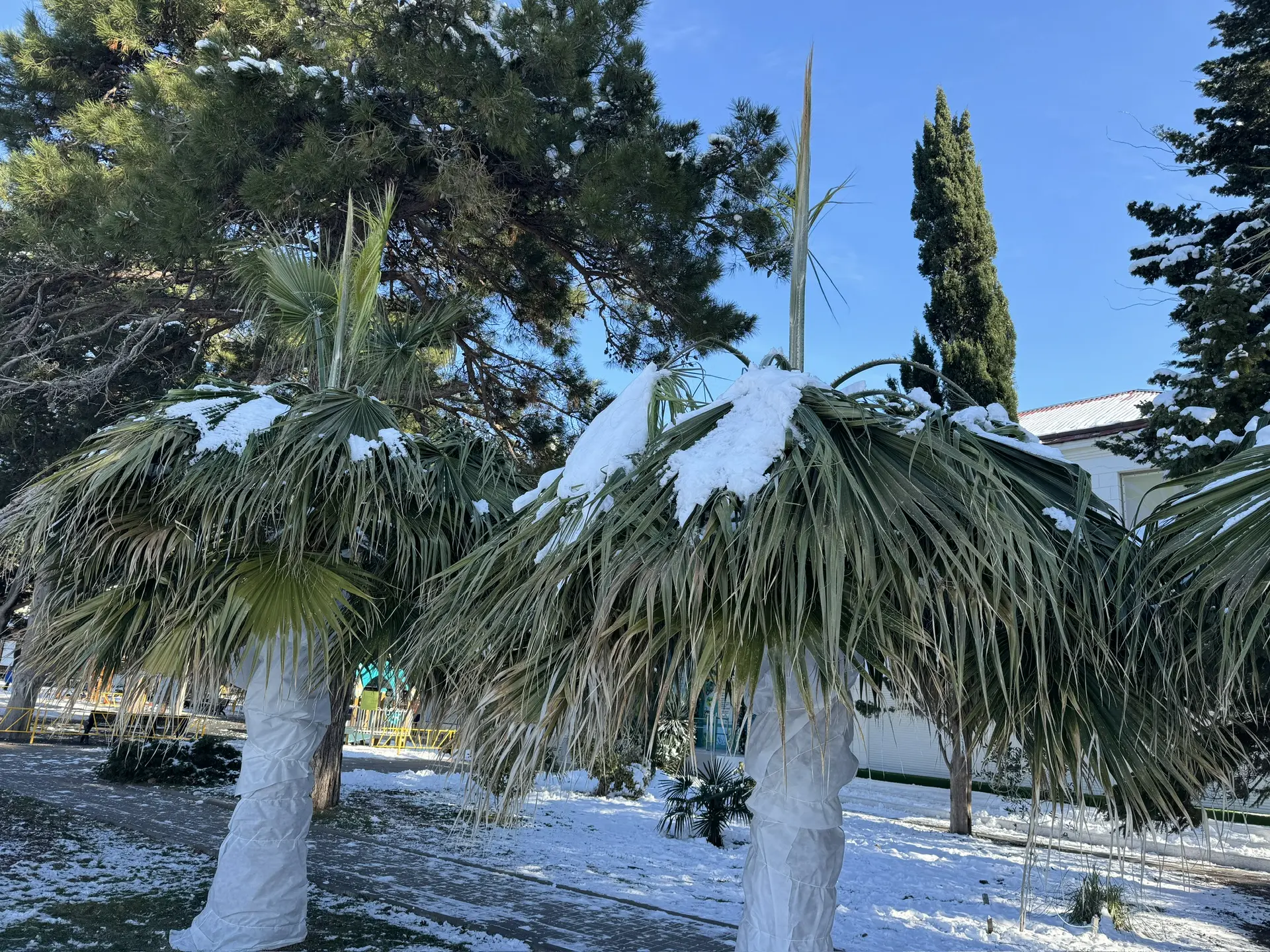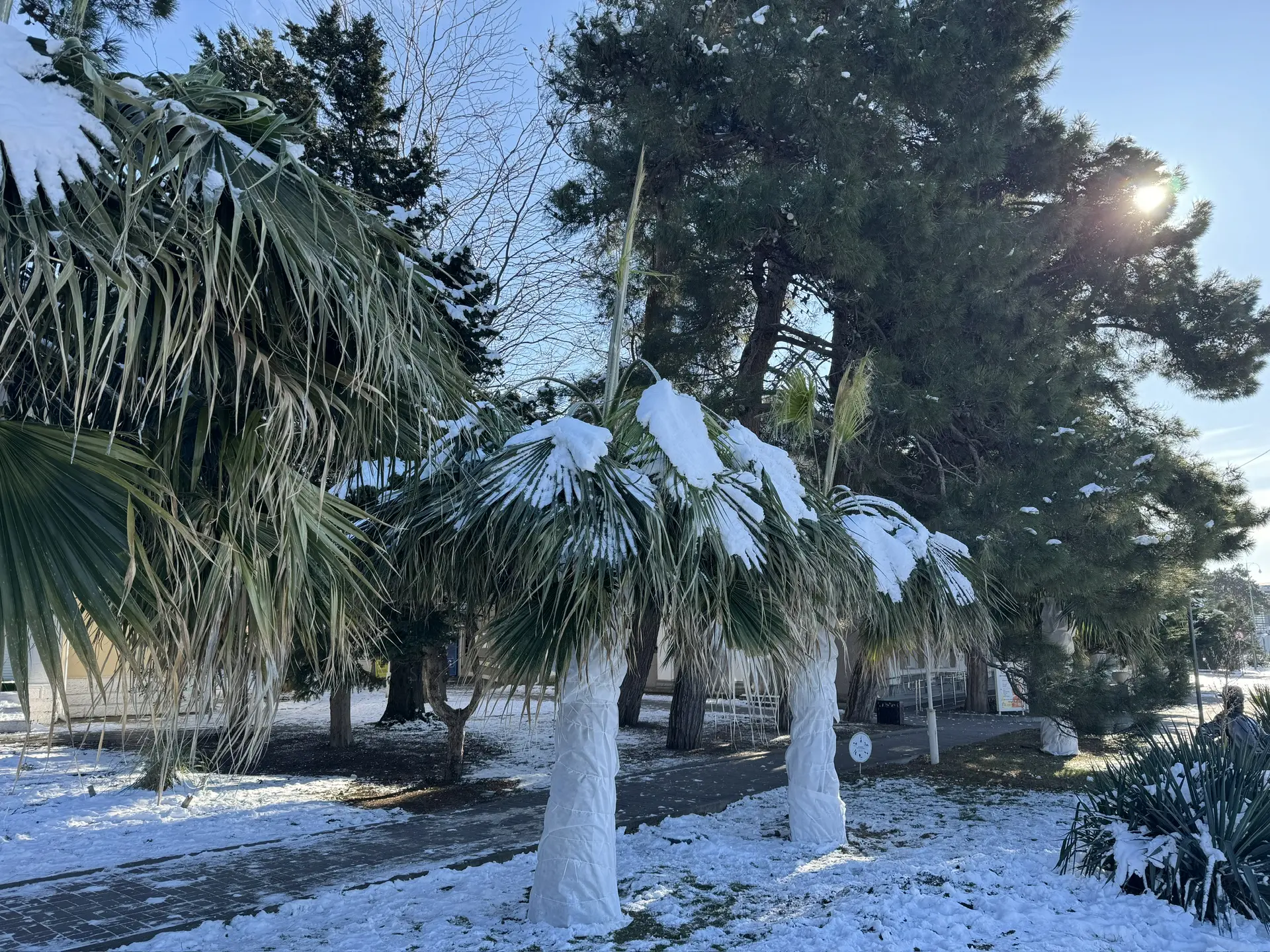 Накануне в городе укрыли все пальмы которые более зимостойкие ( трахикарпусы и хамеропсы ) а вот вашингтонии не укрыли до конца, очень странное решение!!!