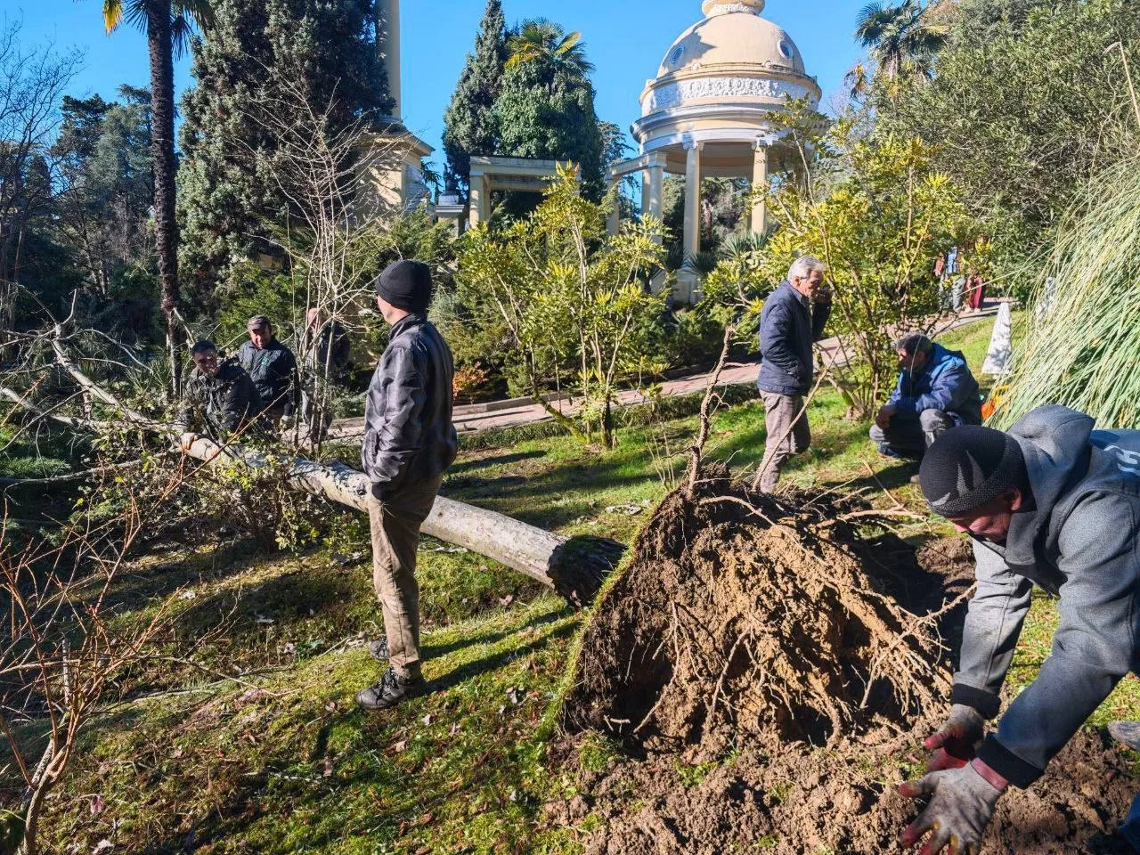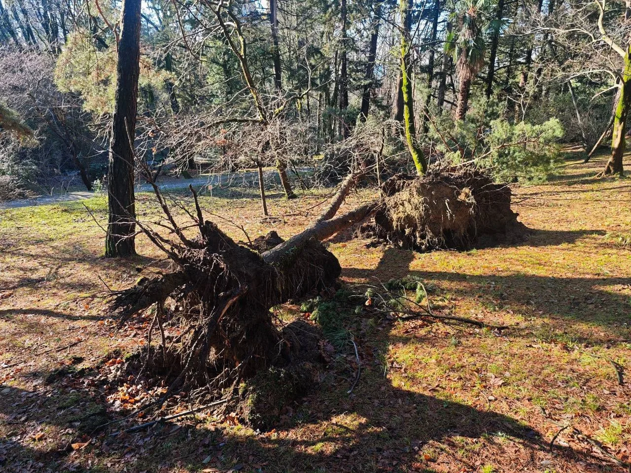 Недавний удар стихии: сильный снег и ураганный ветер оставили в парке заметный след: повалено и повреждено больше 50 деревьев и кустарников, в том числе пальмы.