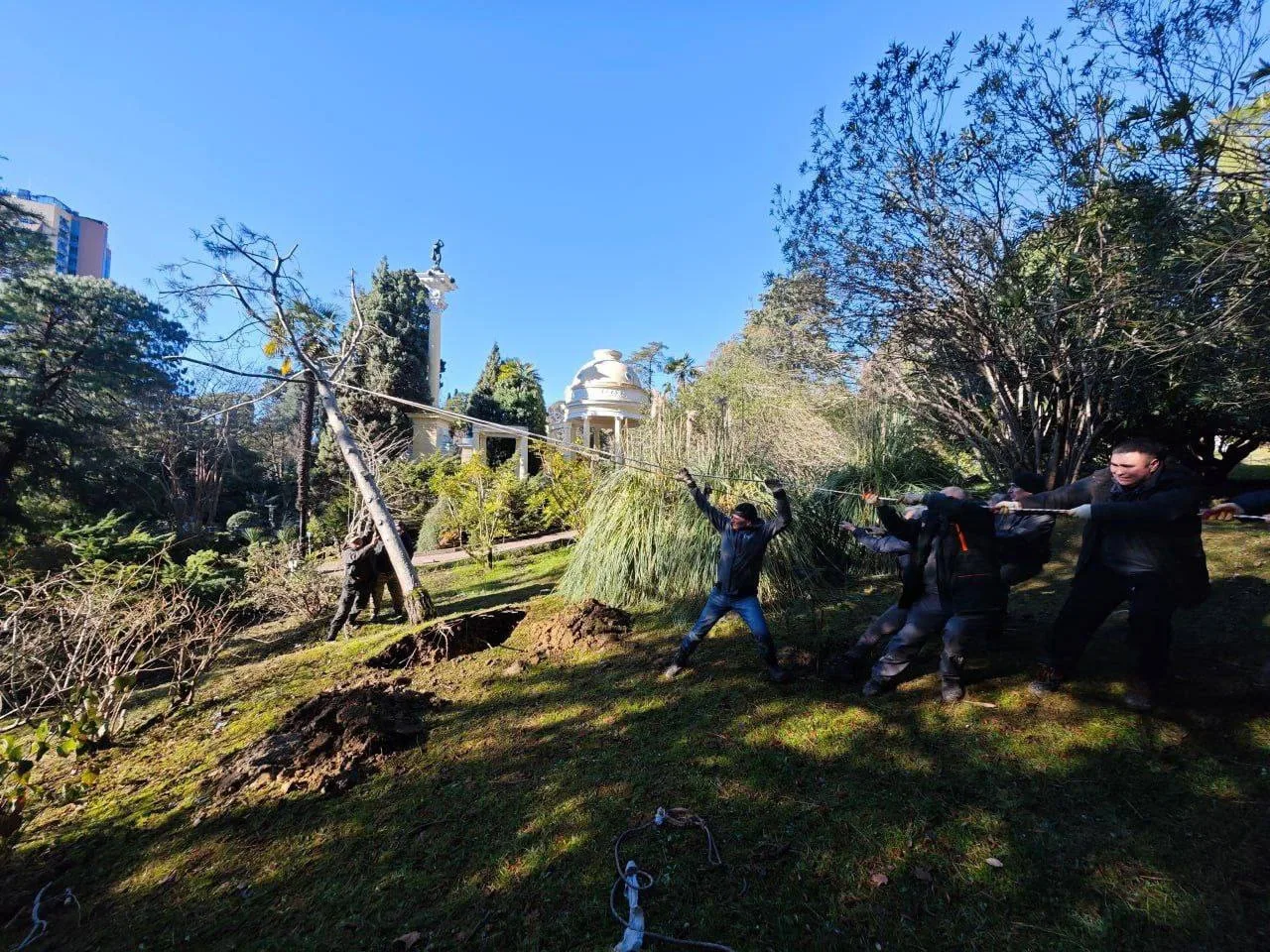 После осмотра специалисты выяснили, что корни дерева почти не пострадали. Чтобы минимизировать нагрузку на ствол, рабочие обрезали крону и с помощью техники аккуратно подняли сосну, закрепив её в новом положении.