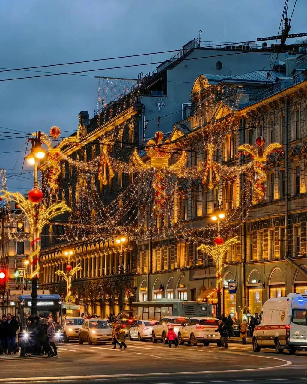 На главном проспекте Петербурга зажглась праздничная подсветка! Теперь Невский проспект сияет белыми, красными и желтыми огнями, освещая дорогу с 16 до 9 часов.