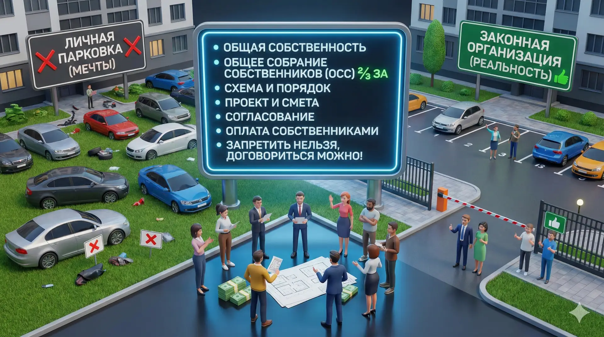 Закрепить за собой конкретный «карман» юридически нельзя. Но можно организовать парковку по правилам — через общее собрание собственников.