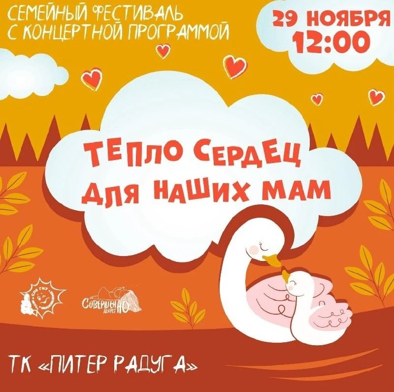 29 ноября в 12:00 в торгово-развлекательном комплексе «Питер Радуга» молодёжно-подростковый центр «Московский» проведёт семейный фестиваль «Тепло сердец для наших мам».