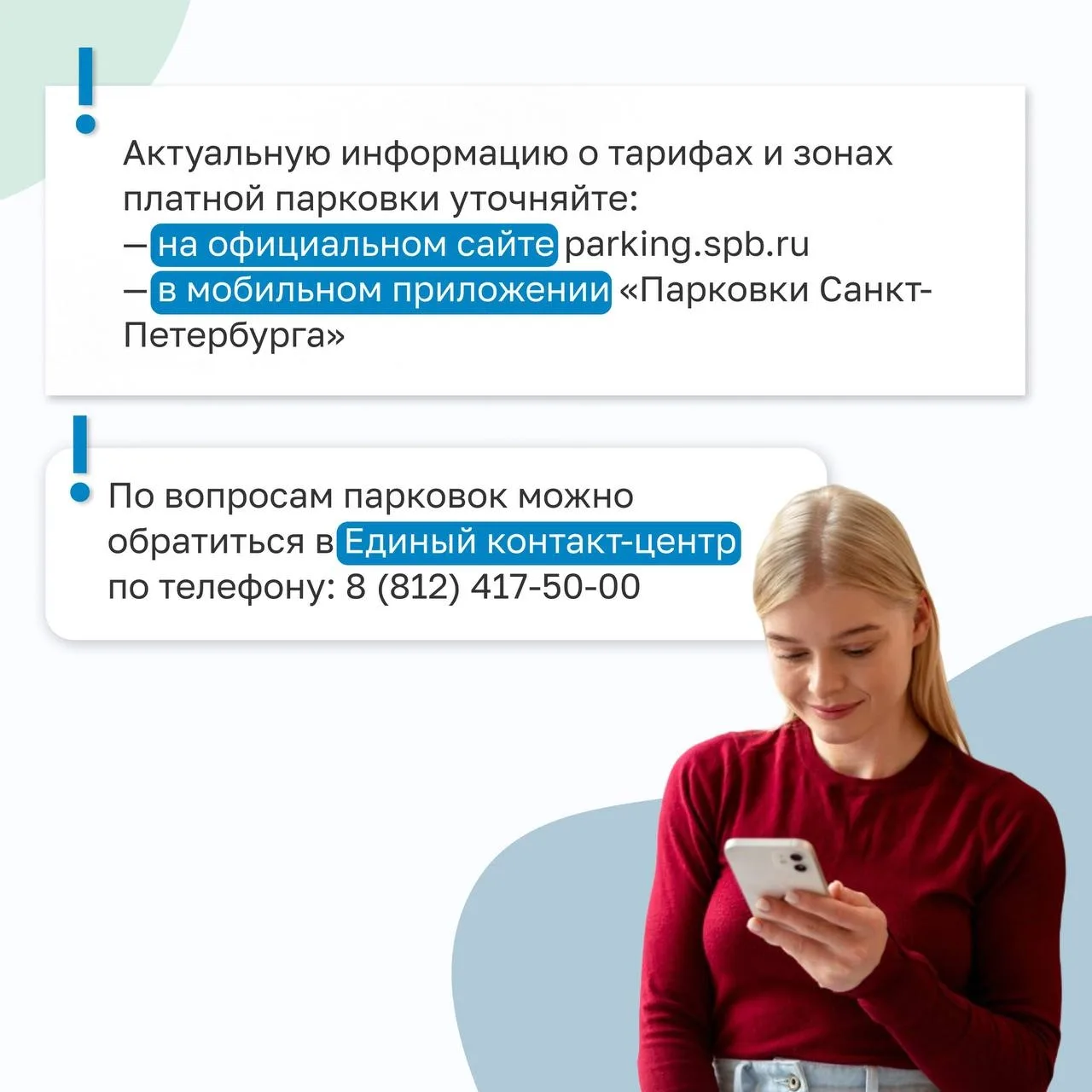 Актуальную информацию о тарифах и зонах платной парковки уточняйте на официальном сайте или в мобильном приложении «Парковки Санкт-Петербурга». По вопросам парковок можно обратиться в Единый контакт-центр по телефону 8 (812) 417-50-00.