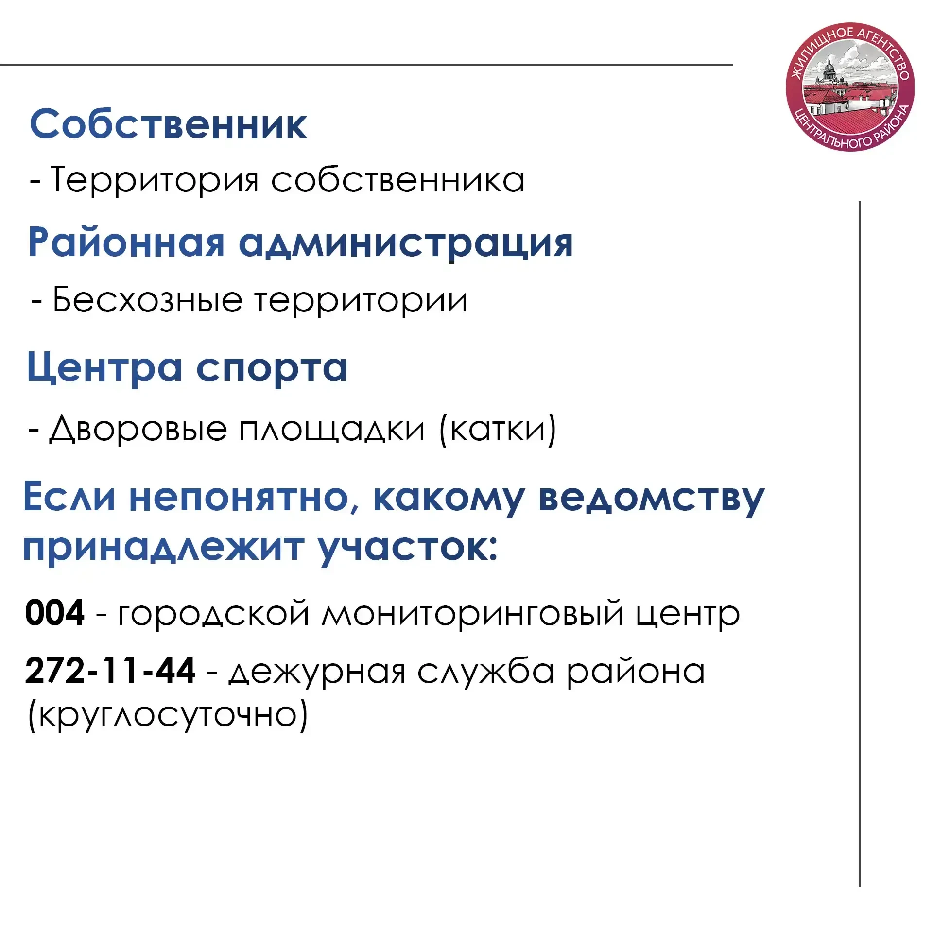 Снег в Петербурге еще не лег, но информация будет полезна. 👌Мы подготовили для вас информационные карточки с зонами ответственности за уборку территорий и контактах для обращений при проблемах с уборкой снега.