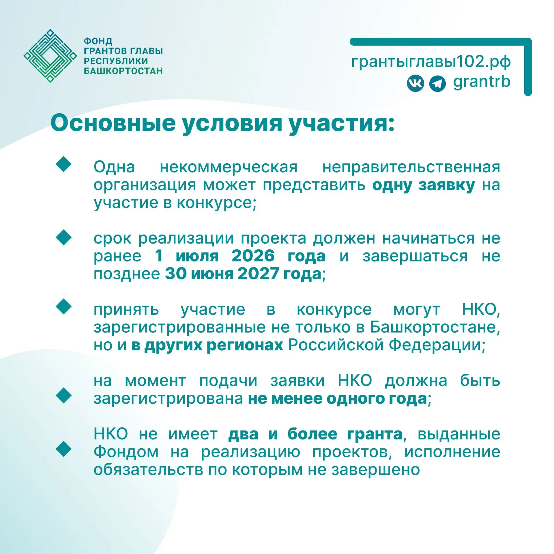 Заявку можно подать до 17:00 2 апреля 2026 года на сайте: грантыглавы102.рф. Условия участия в конкурсе – в карточках.