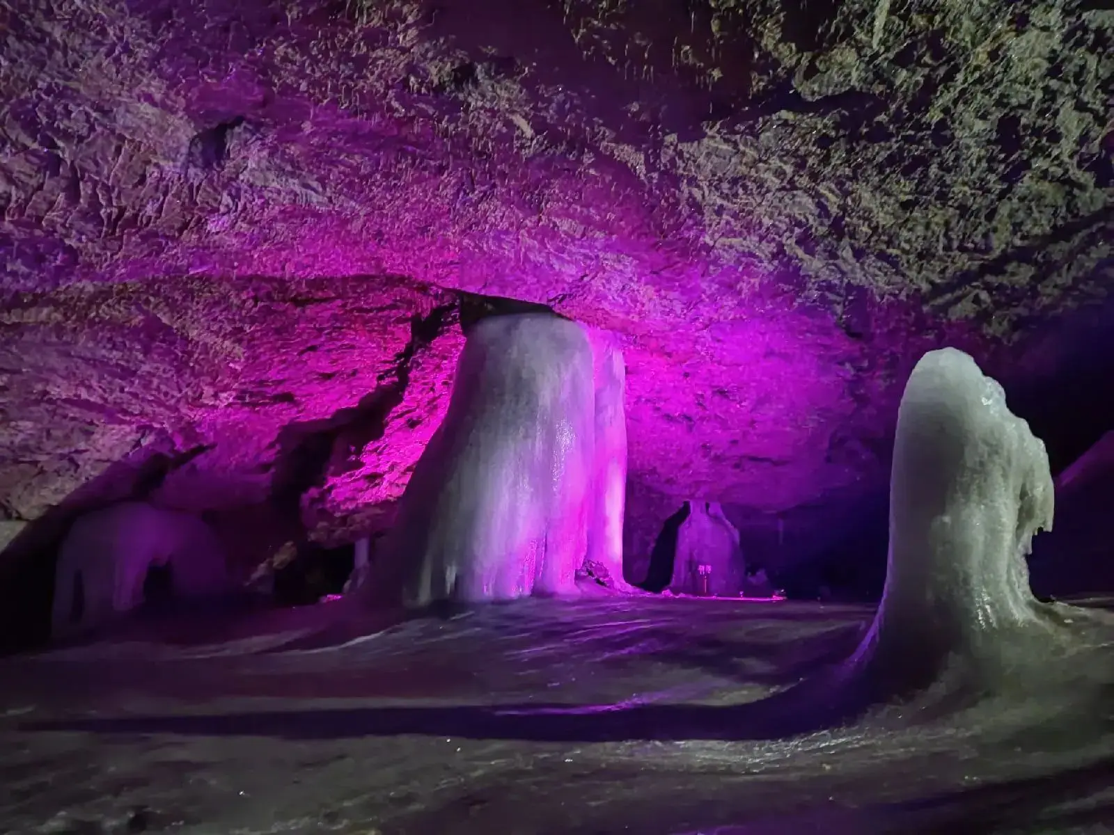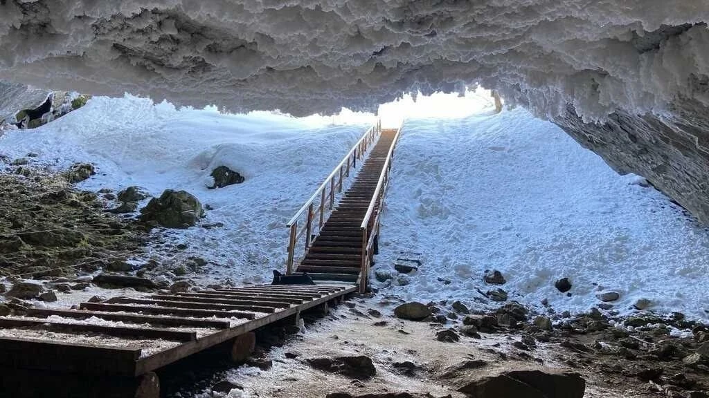🧊 Главное чудо – реликтовый ледник. Даже летом температура здесь ниже нуля, а пол устилает лед глубиной до 20 метров! Зимой сталагмиты вырастают до 15 метров. Самый известный называют «Снежной королевой».