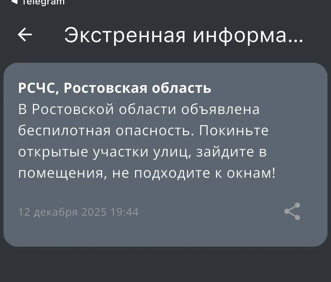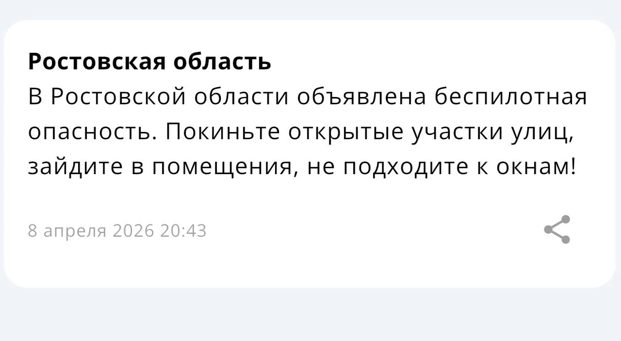 ⚠️ Беспилотная опасность объявлена в Ростовской области.
