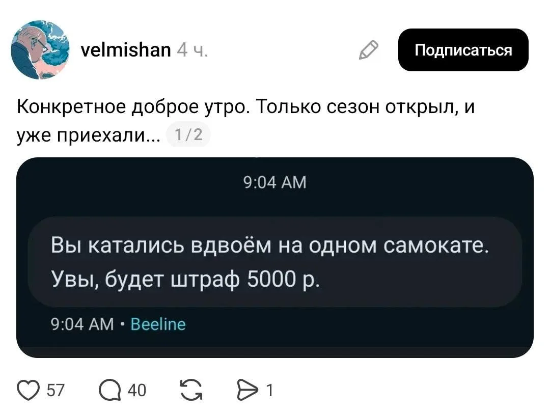 😘 Москвичей уже начали штрафовать на 5 тысяч рублей за езду на электросамокате вдвоём