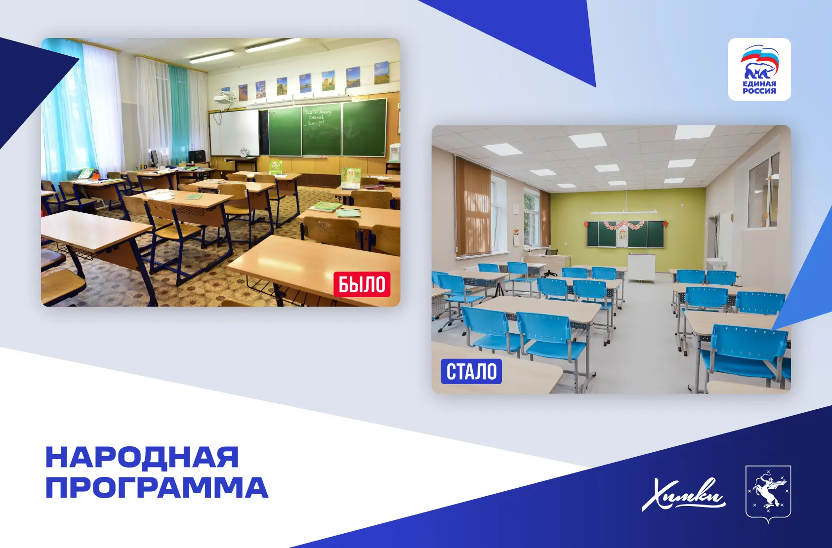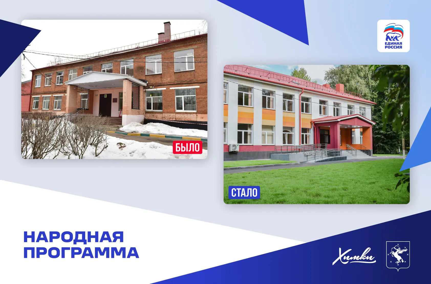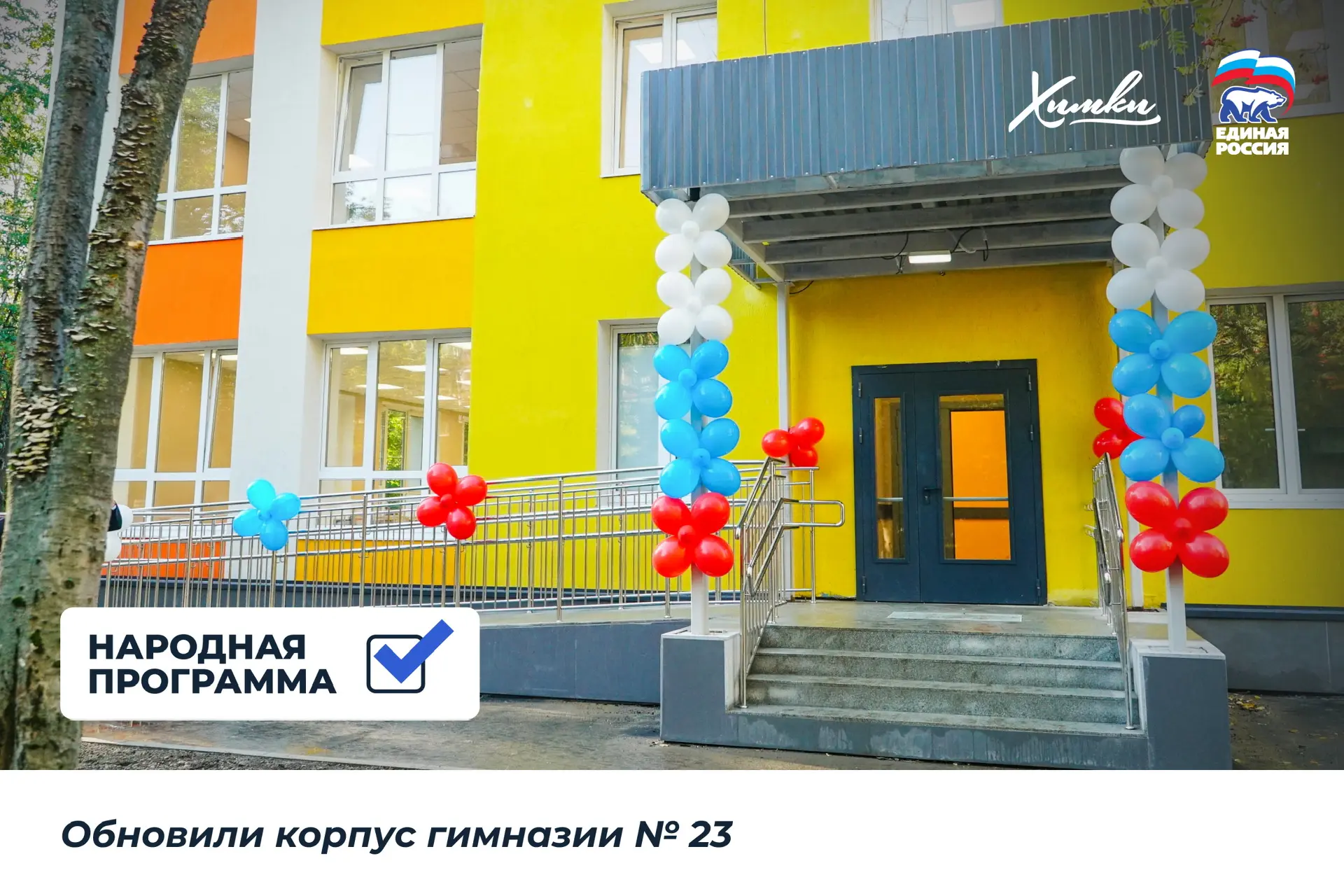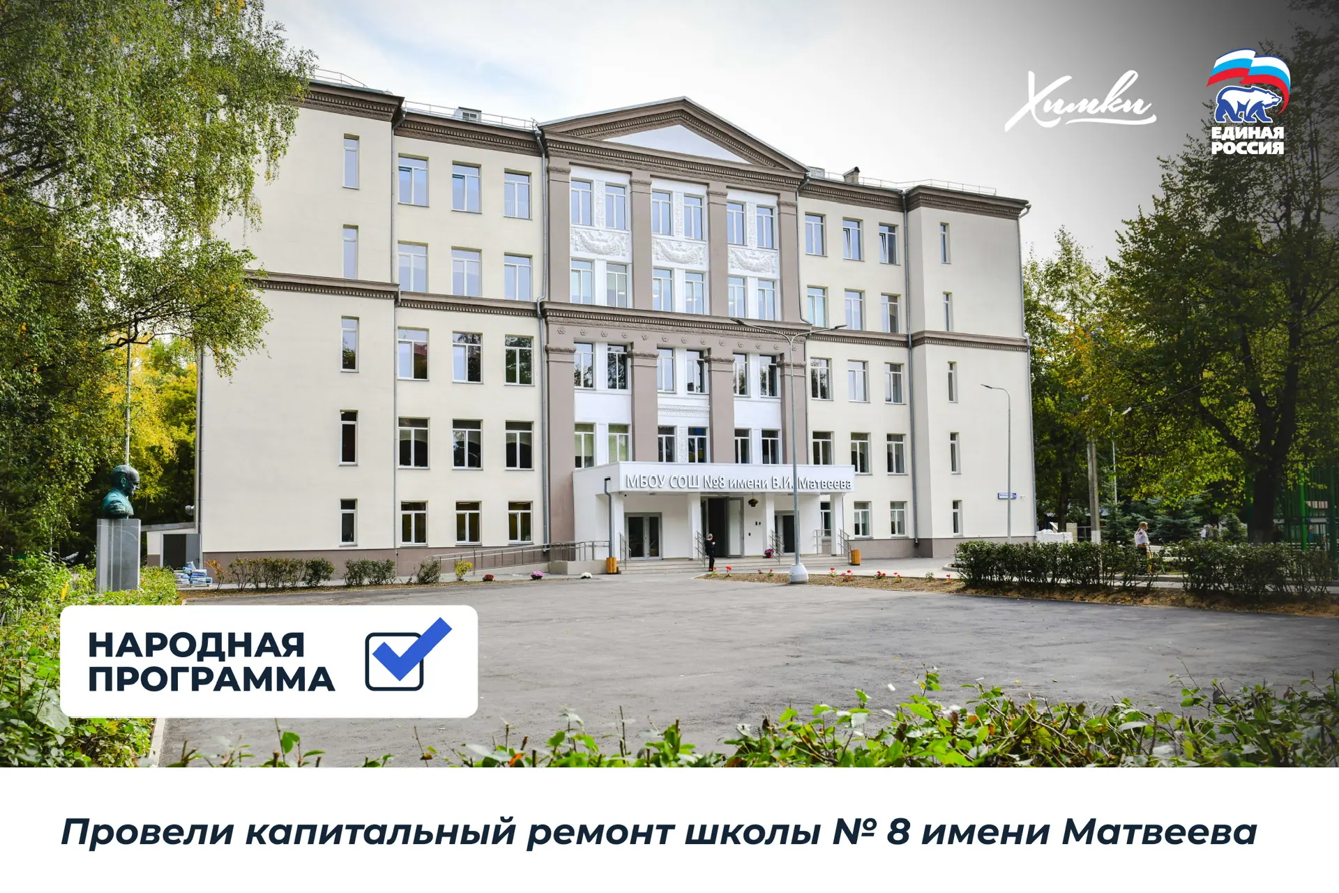Кроме этого, в Химках по Народной программе построили две школы в кварталах «Солнечная Система» и «Маяк», детские сады в Рузино, Ивакино и Юрлово. Проведен капитальный ремонт школы №8, «Наследие», «Кадетский корпус», корпуса гимназии №23 и других объектов.