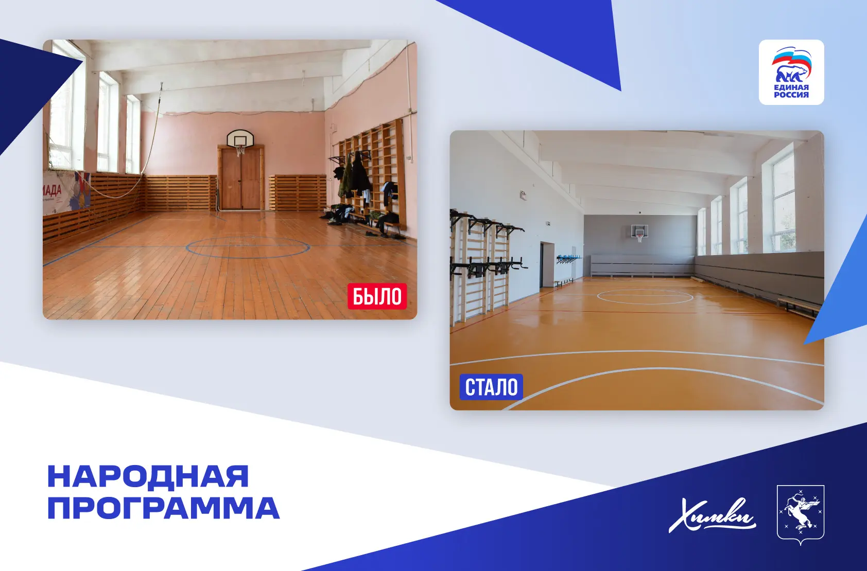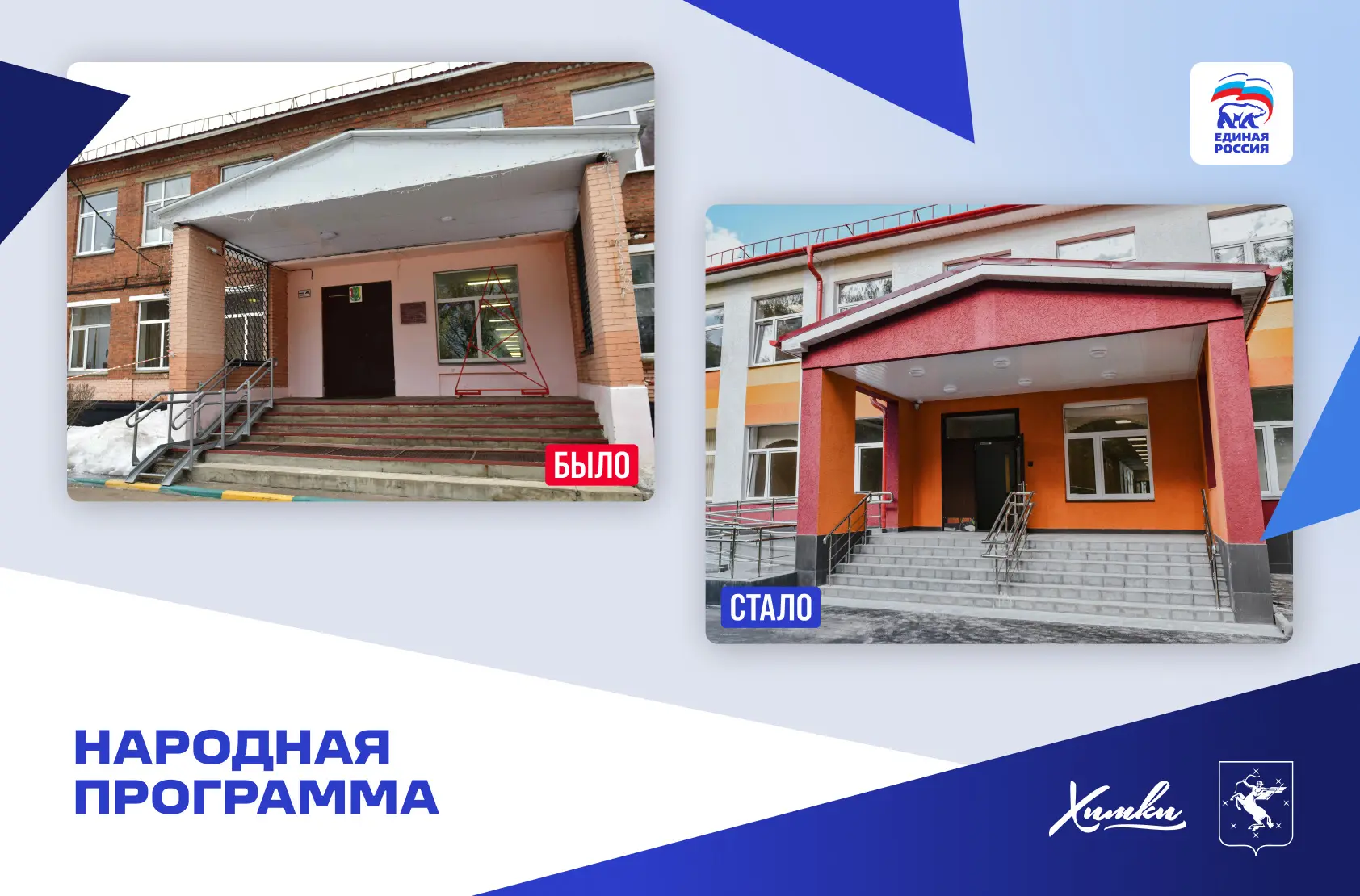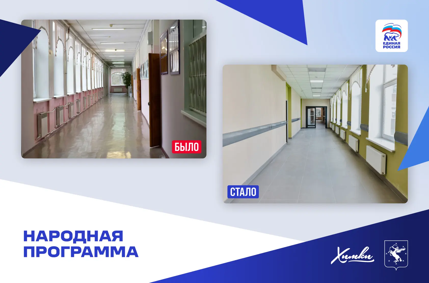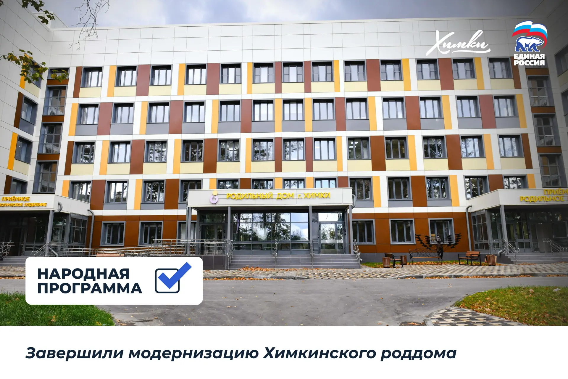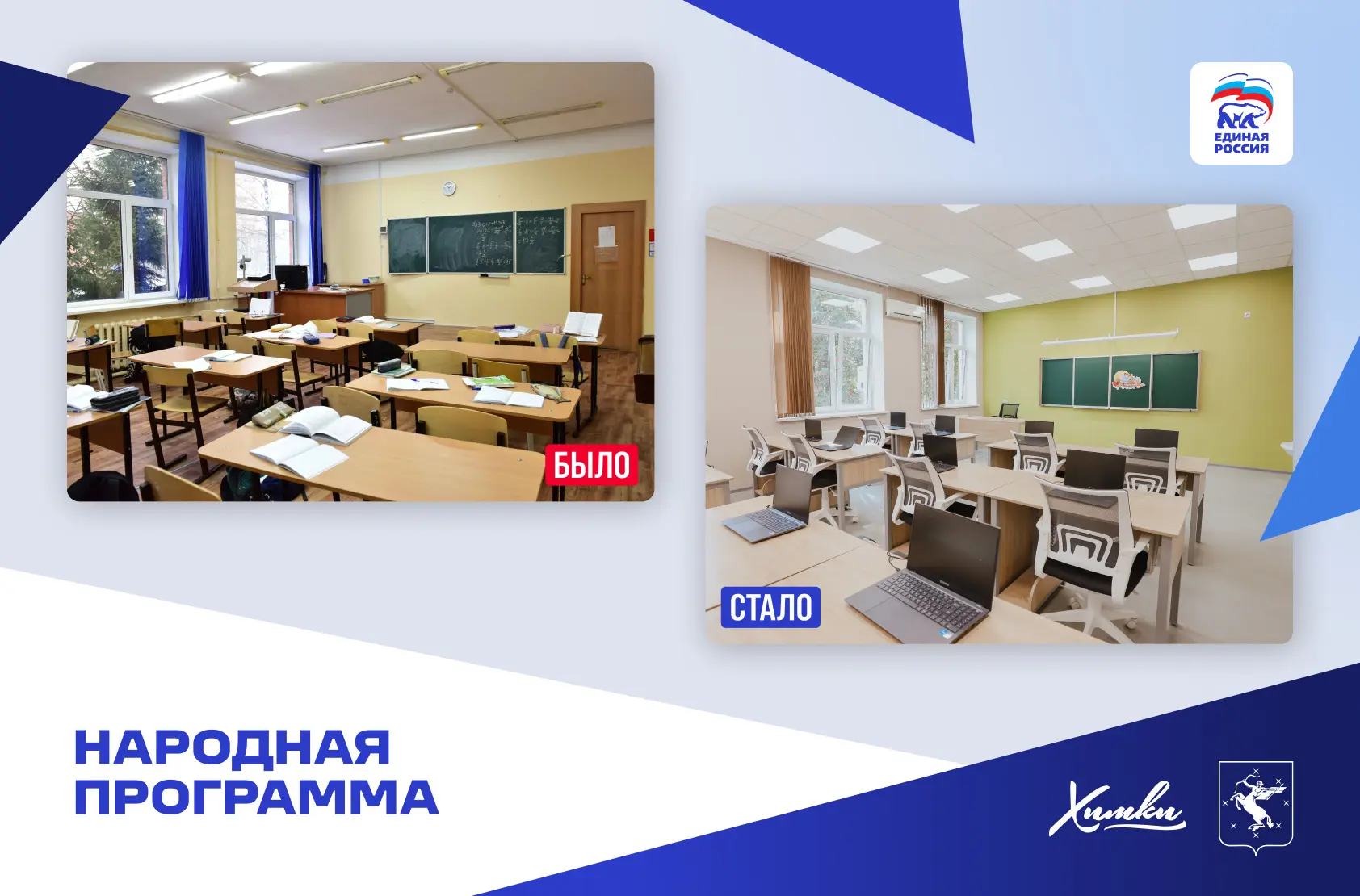 Кроме этого, в Химках по Народной программе построили две школы в кварталах «Солнечная Система» и «Маяк», детские сады в Рузино, Ивакино и Юрлово. Проведен капитальный ремонт школы №8, «Наследие», «Кадетский корпус», корпуса гимназии №23 и других объектов.