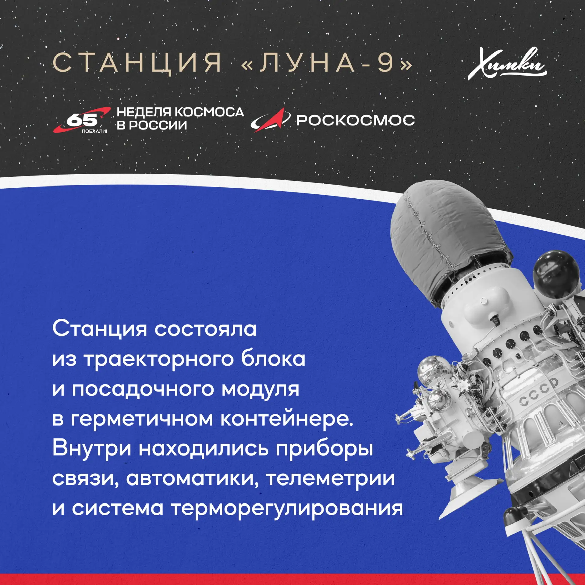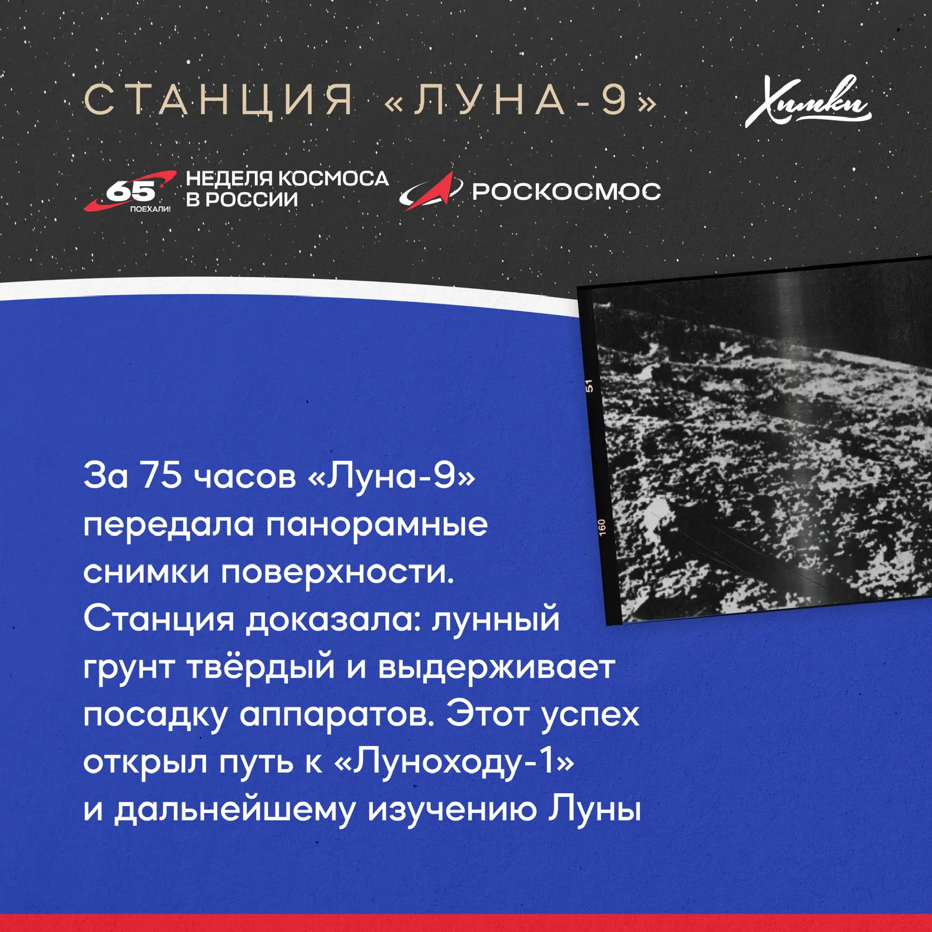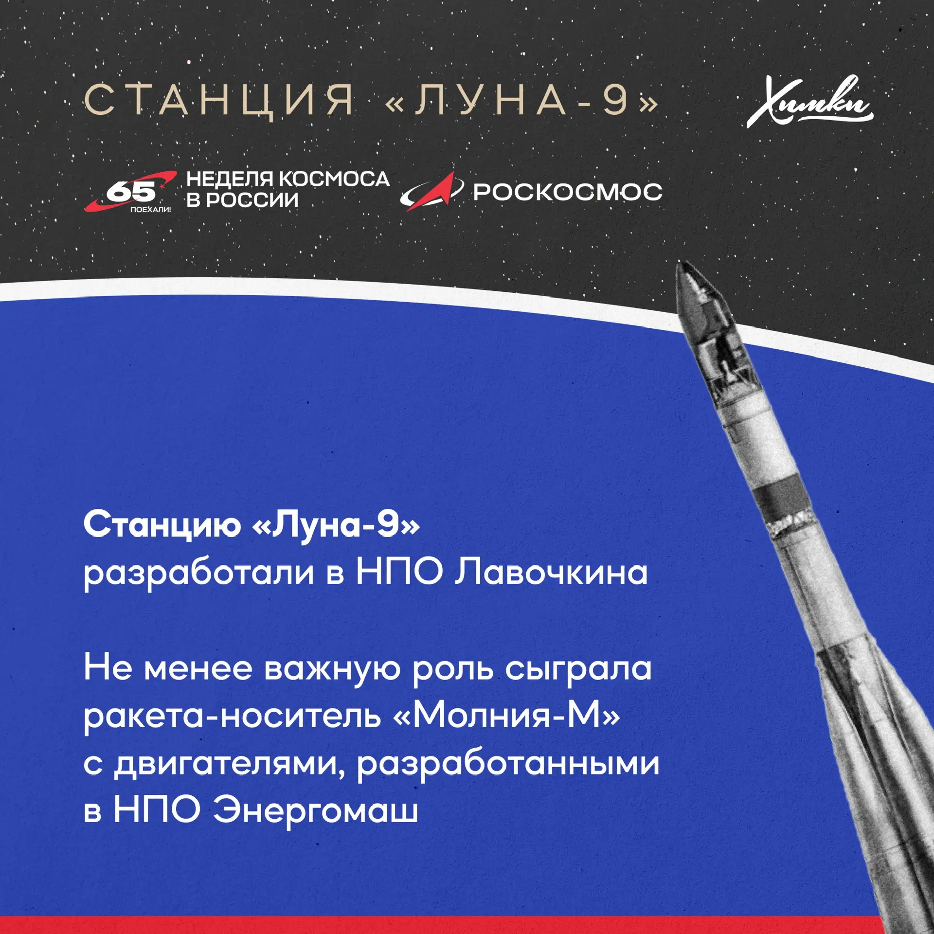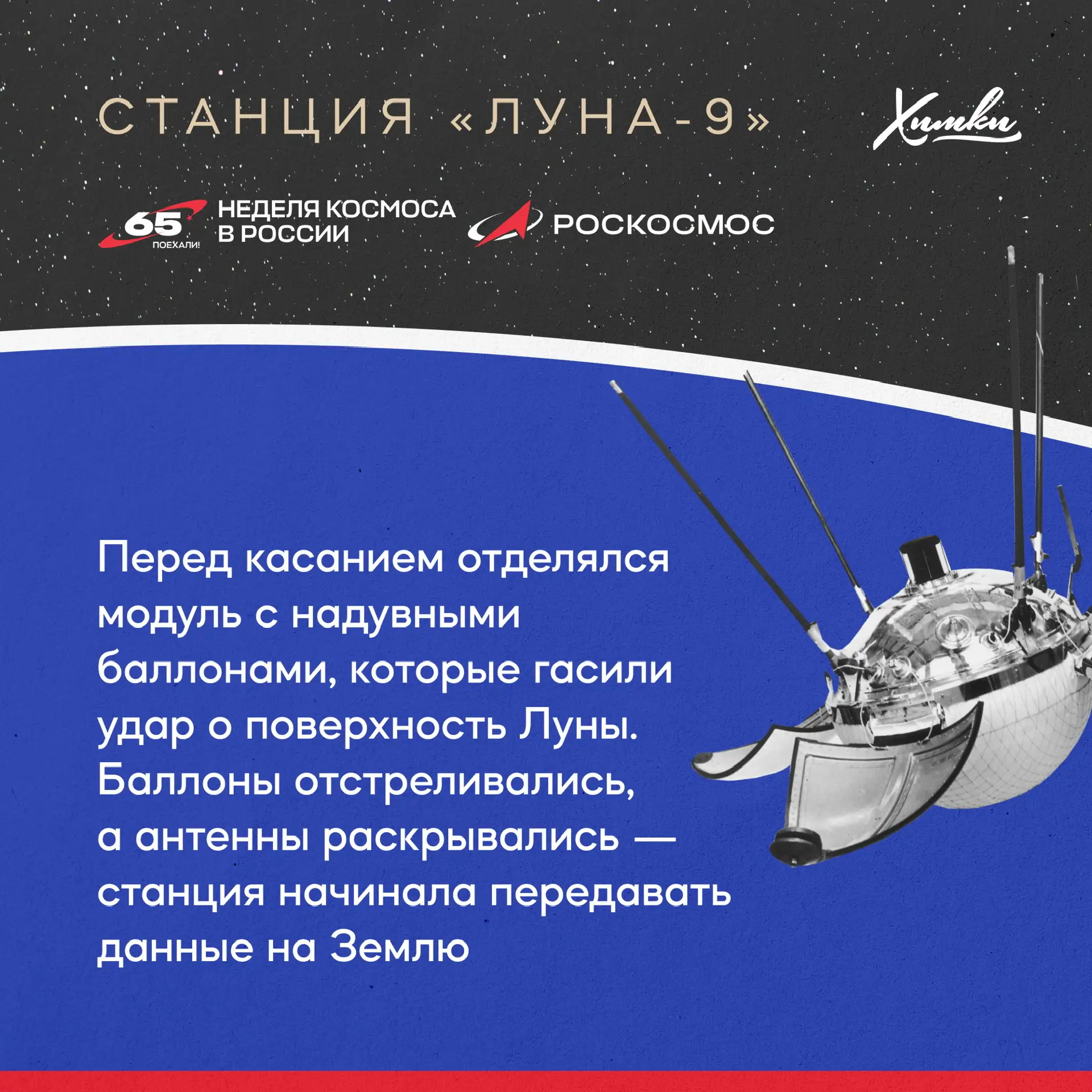 3 февраля 1966 года советская станция «Луна-9» впервые в истории совершила мягкую посадку на поверхность Луны. Этот прорыв стал возможен благодаря работе предприятий Химок — НПО Лавочкина и НПО Энергомаш.