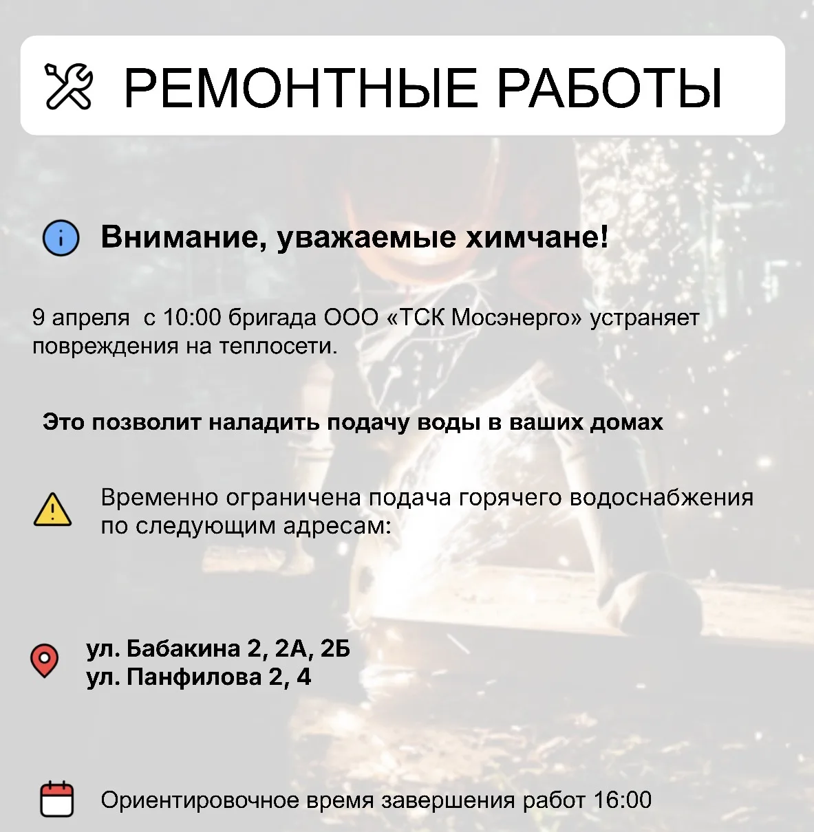 Глава округа Инна Федотова проверила, как идут работы в Новых Химках. Ранее здесь устраняли аварию на тепловых сетях: заменили участок трубопровода и привели в порядок оборудование центрального теплового пункта. Объект обеспечивает теплом и горячей водой восемь многоквартирных домов и детский сад.
