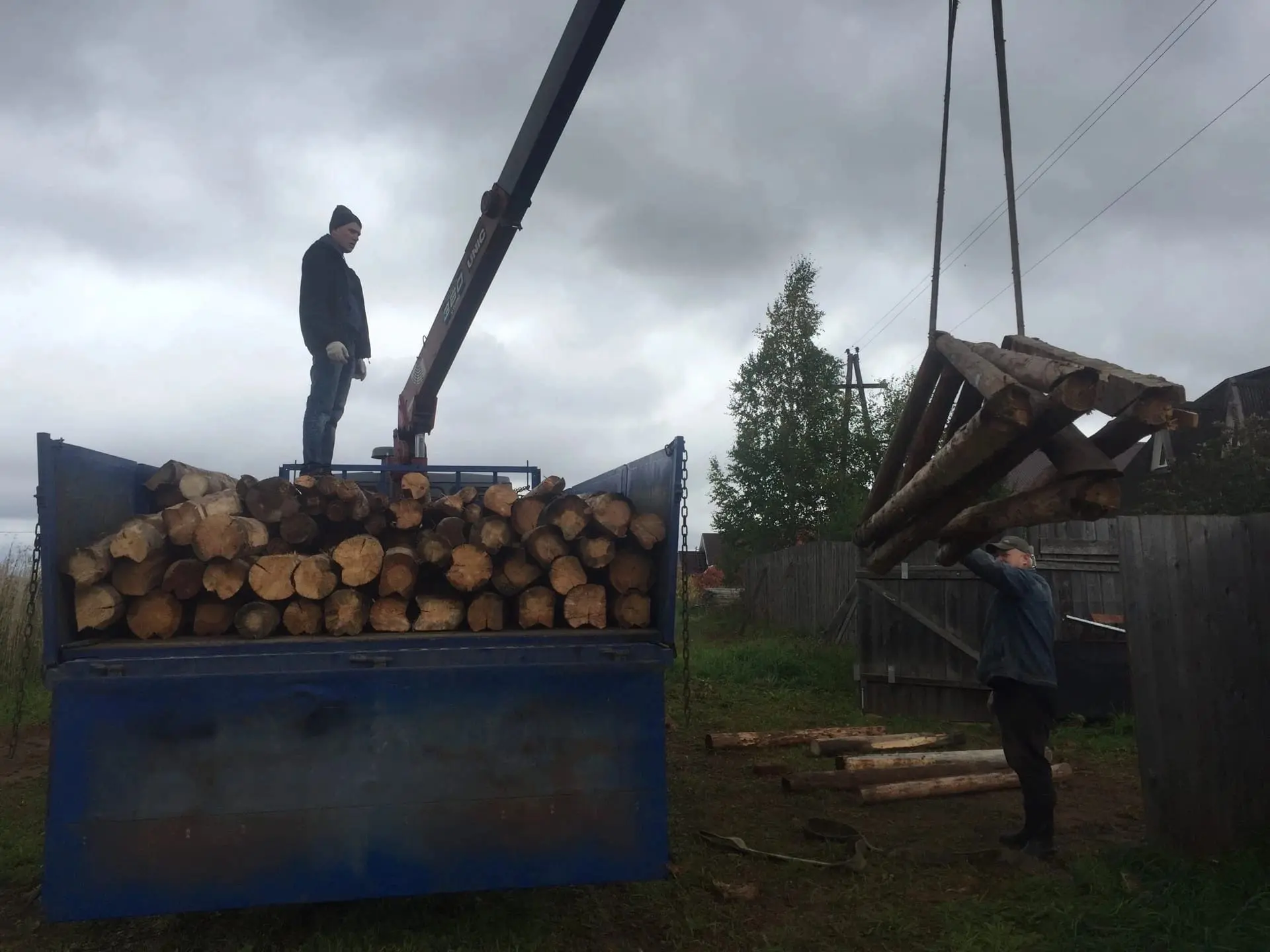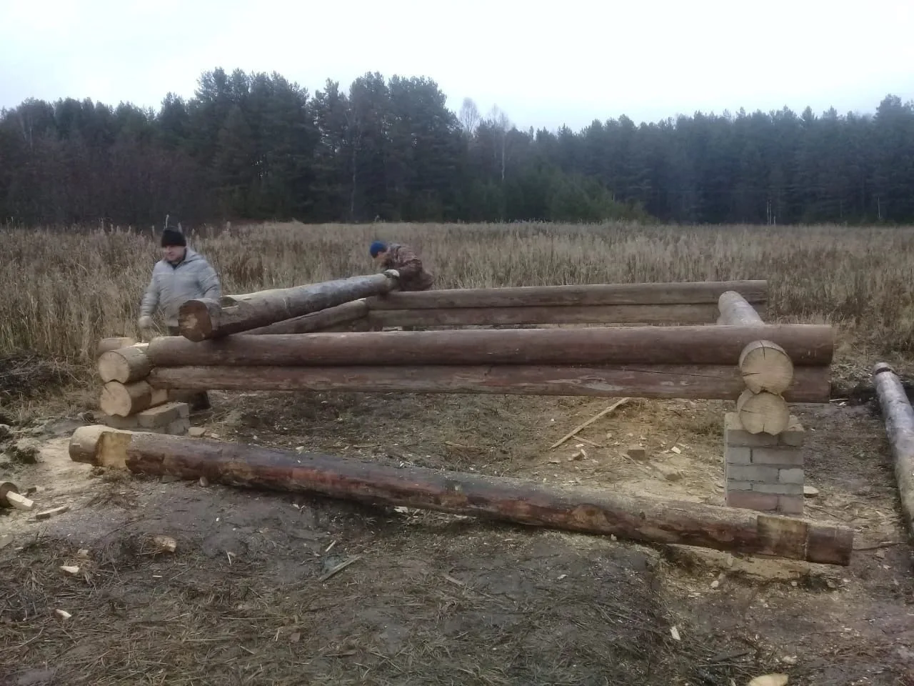 Договорился с камазистом с работы и друг помог погрузить сруб. Стоил он 28 000 рублей, 5 000 я сторговал, в итоге заплатил 23 000. Два нижних бревна были подгнившими, их пришлось оставить.