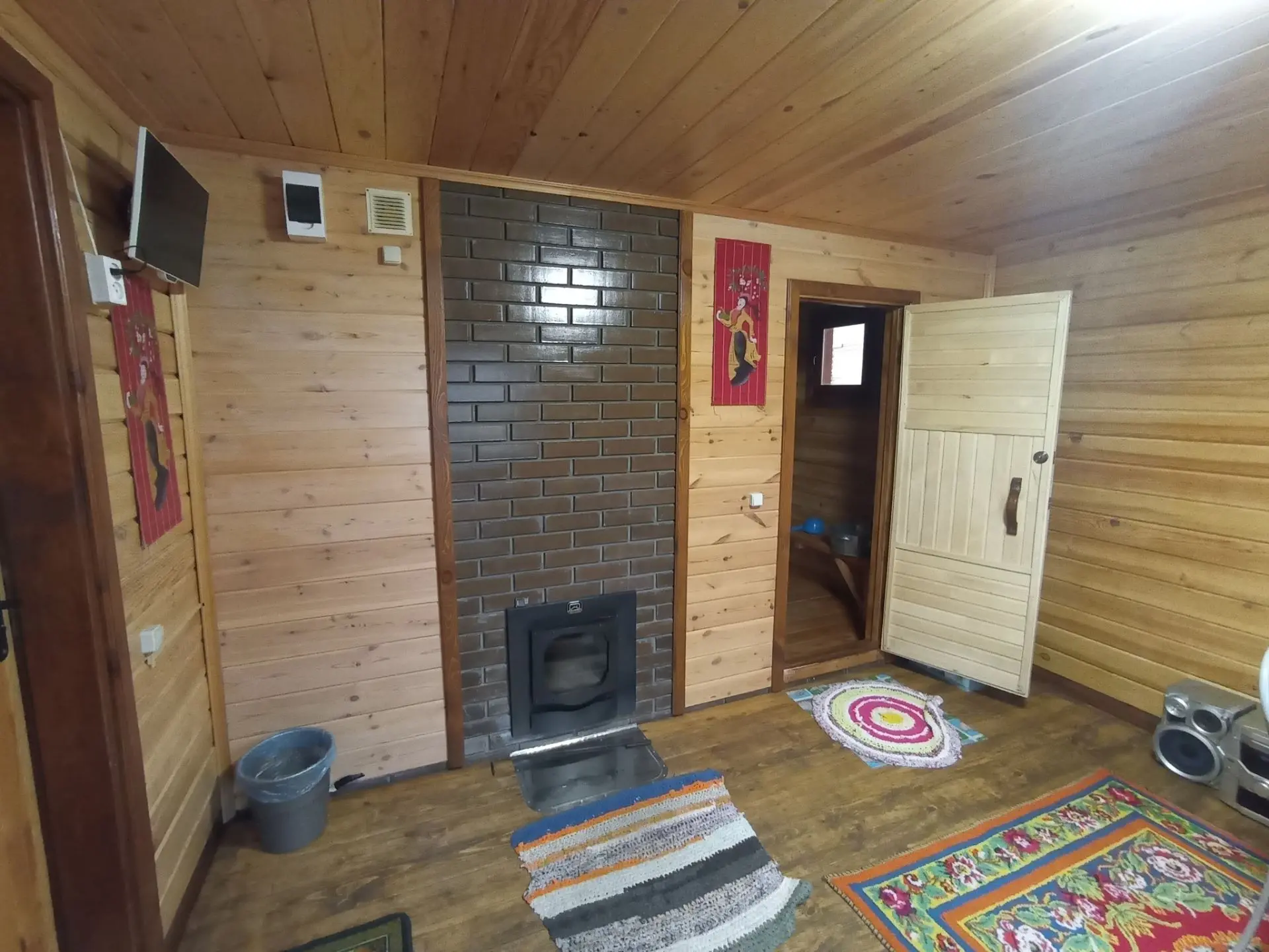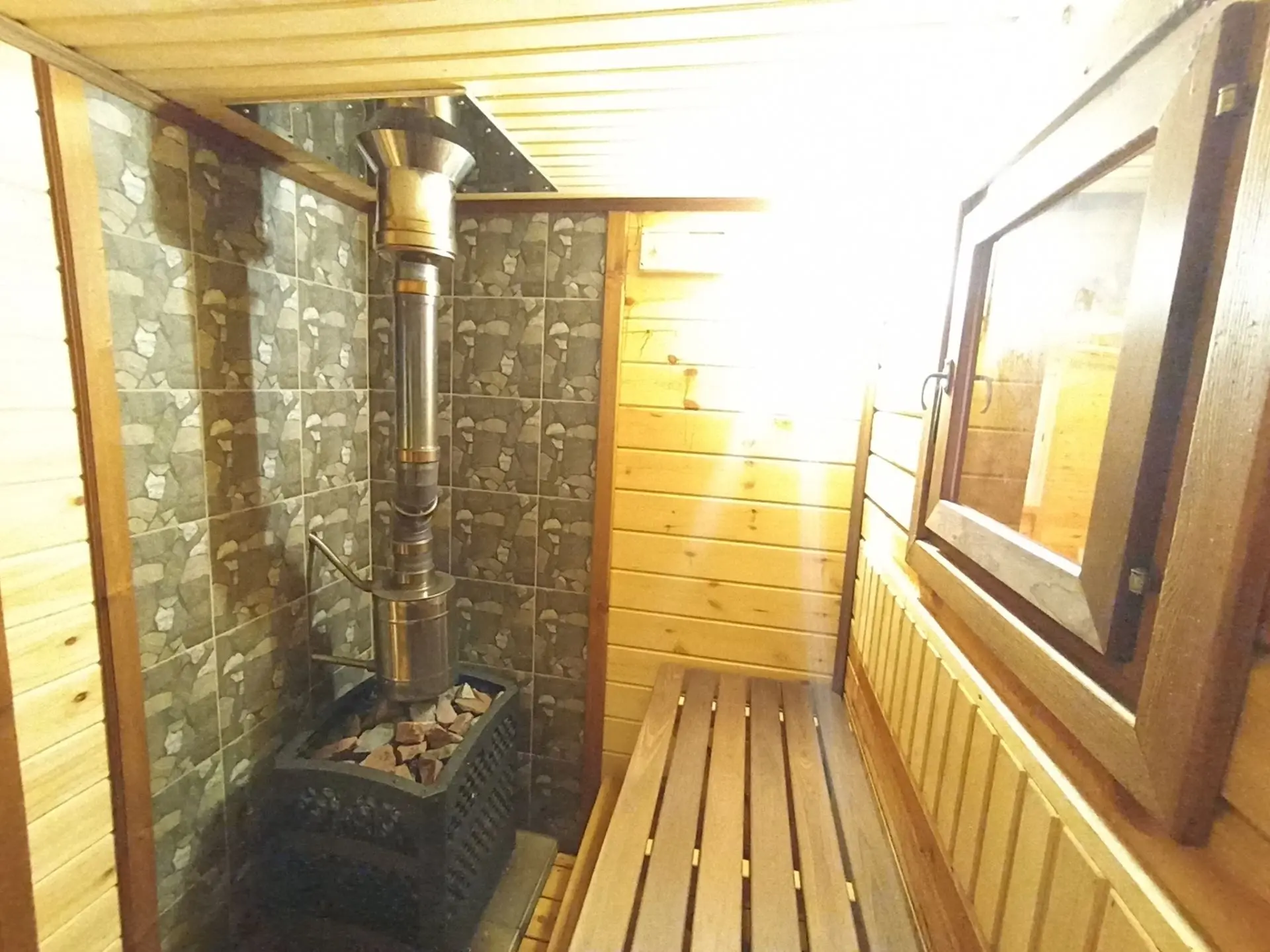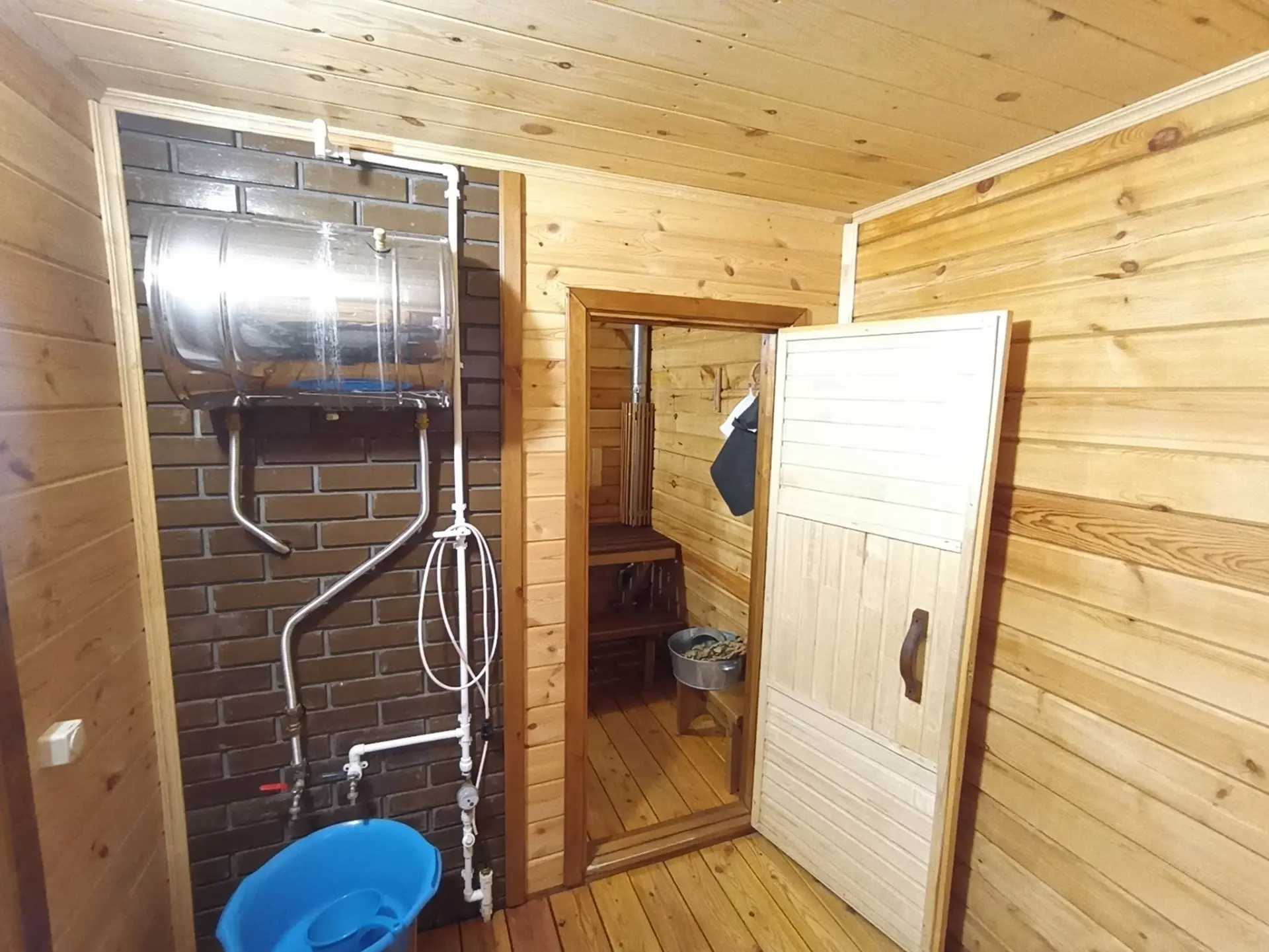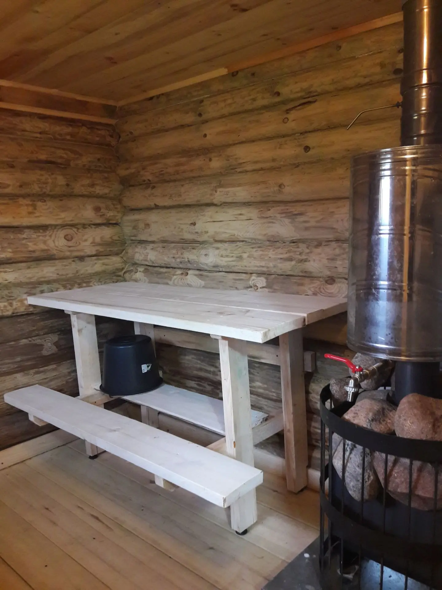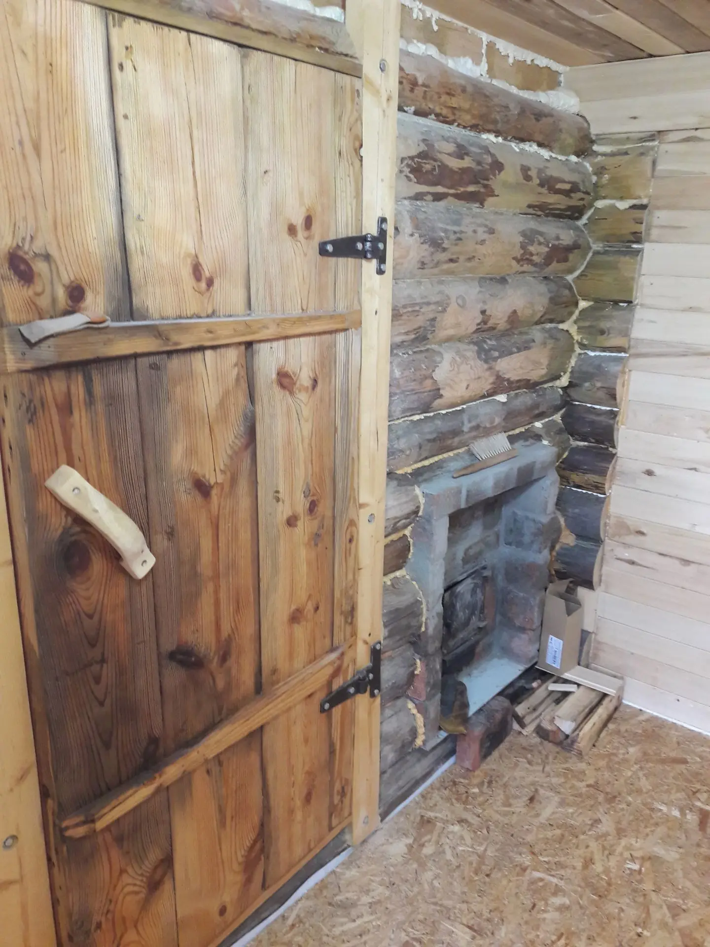 Строил один, наездами в деревню по 3-4 дня. Печку поставил железную с топкой из предбанника, кирпичи для переходного щита насобирал по деревне. Сейчас баня полностью рабочая, остались лишь мелкие недоделки.