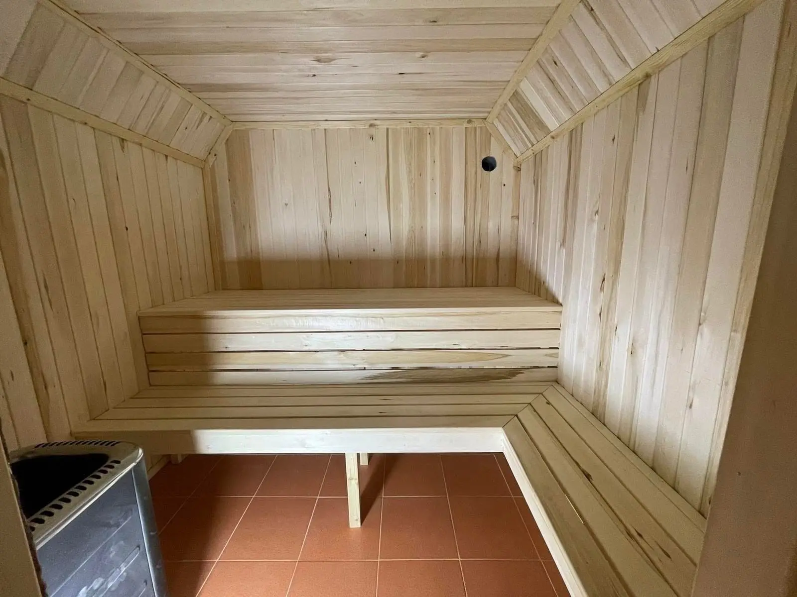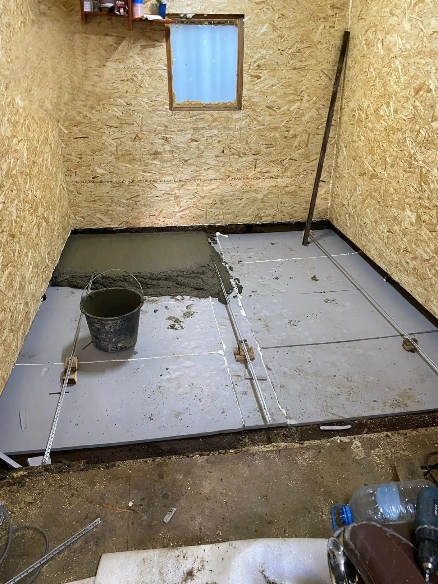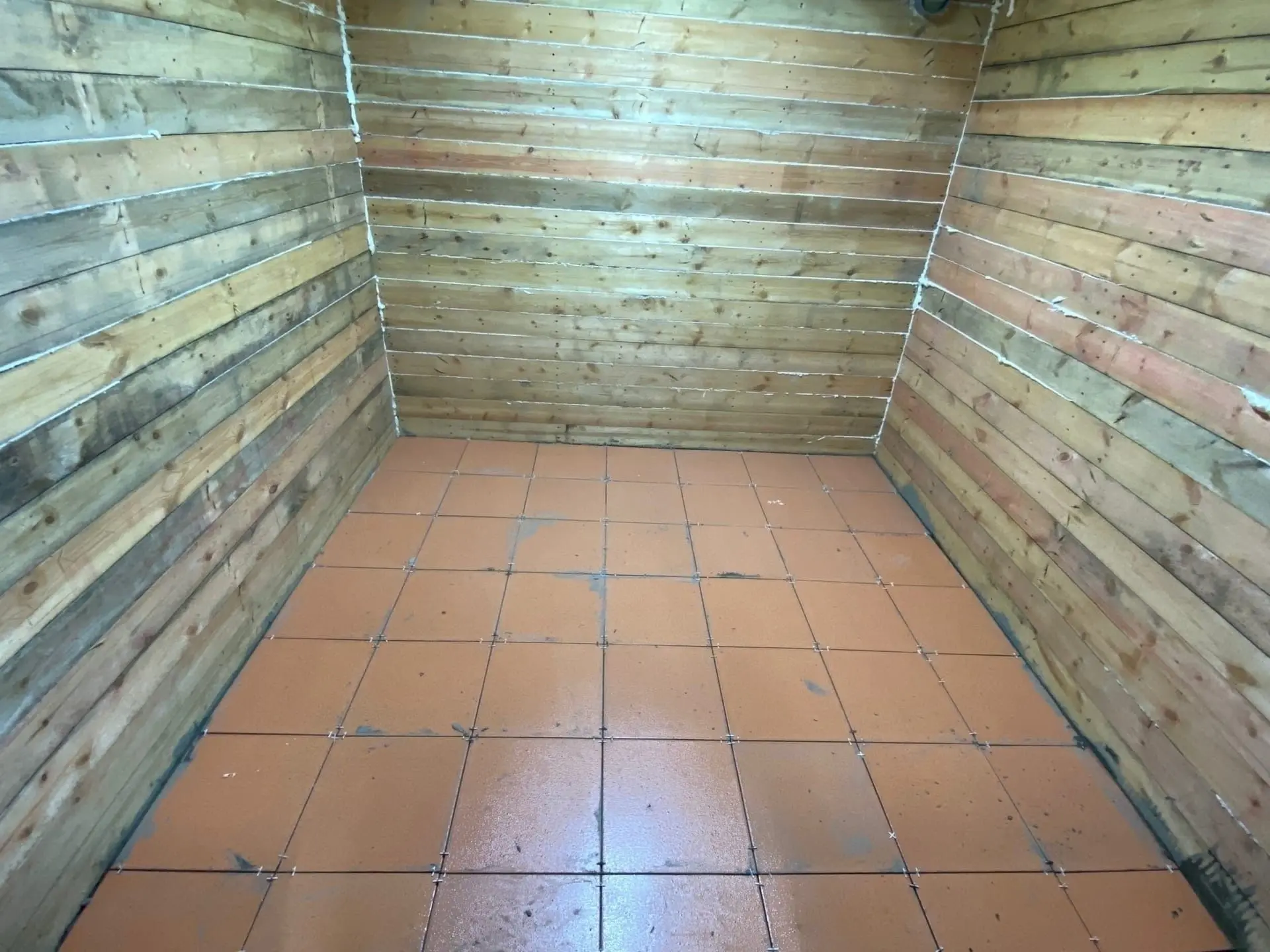Я залил тонкую стяжку и выложил керамическую плитку. Она хорошо держит тепло, легко моется и, что важно, на ней не будет плесени.