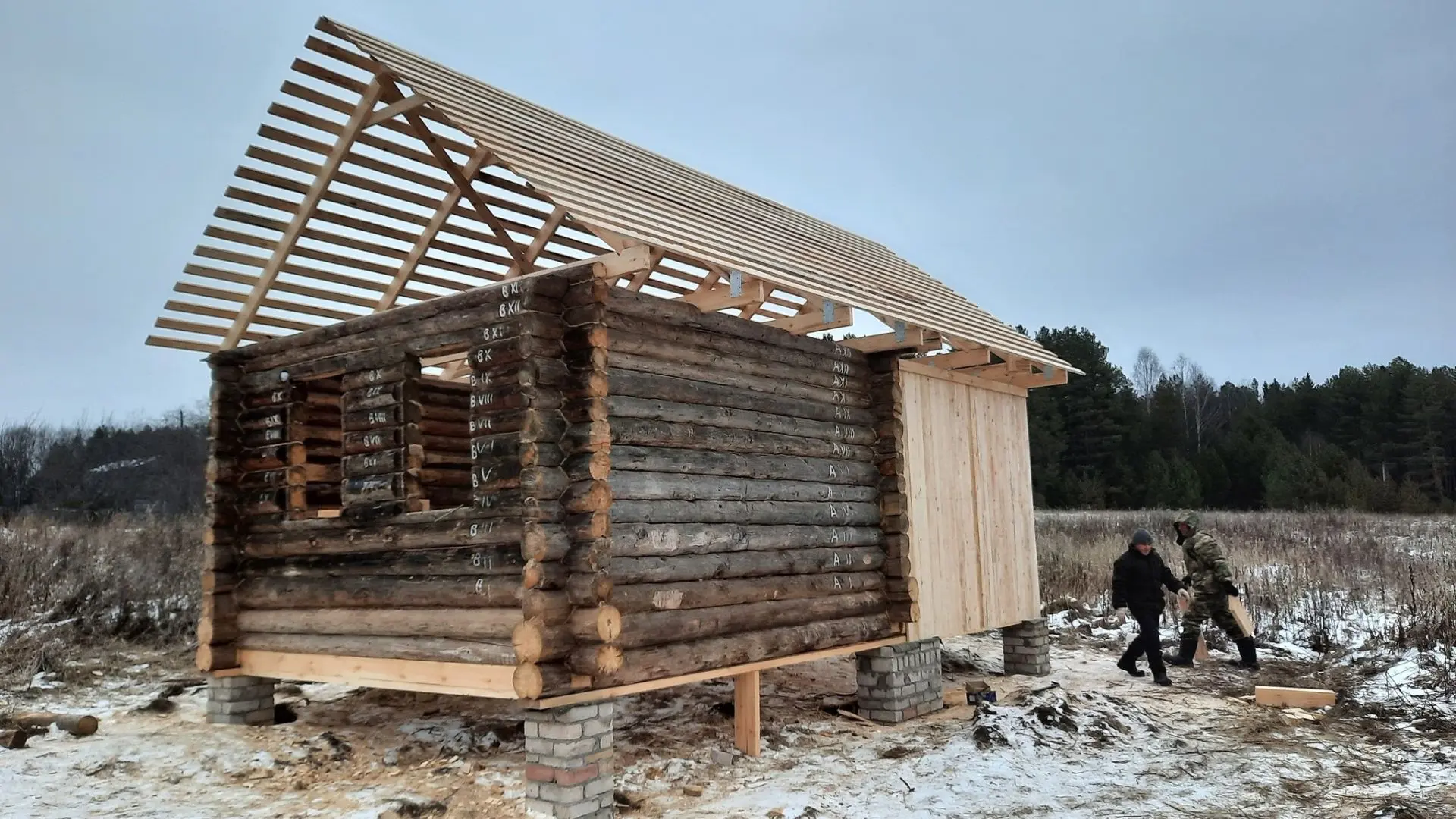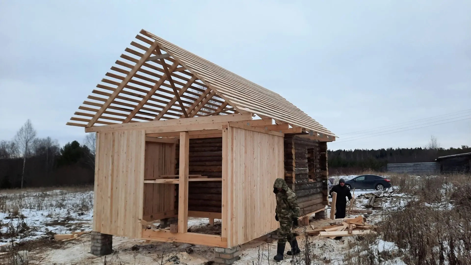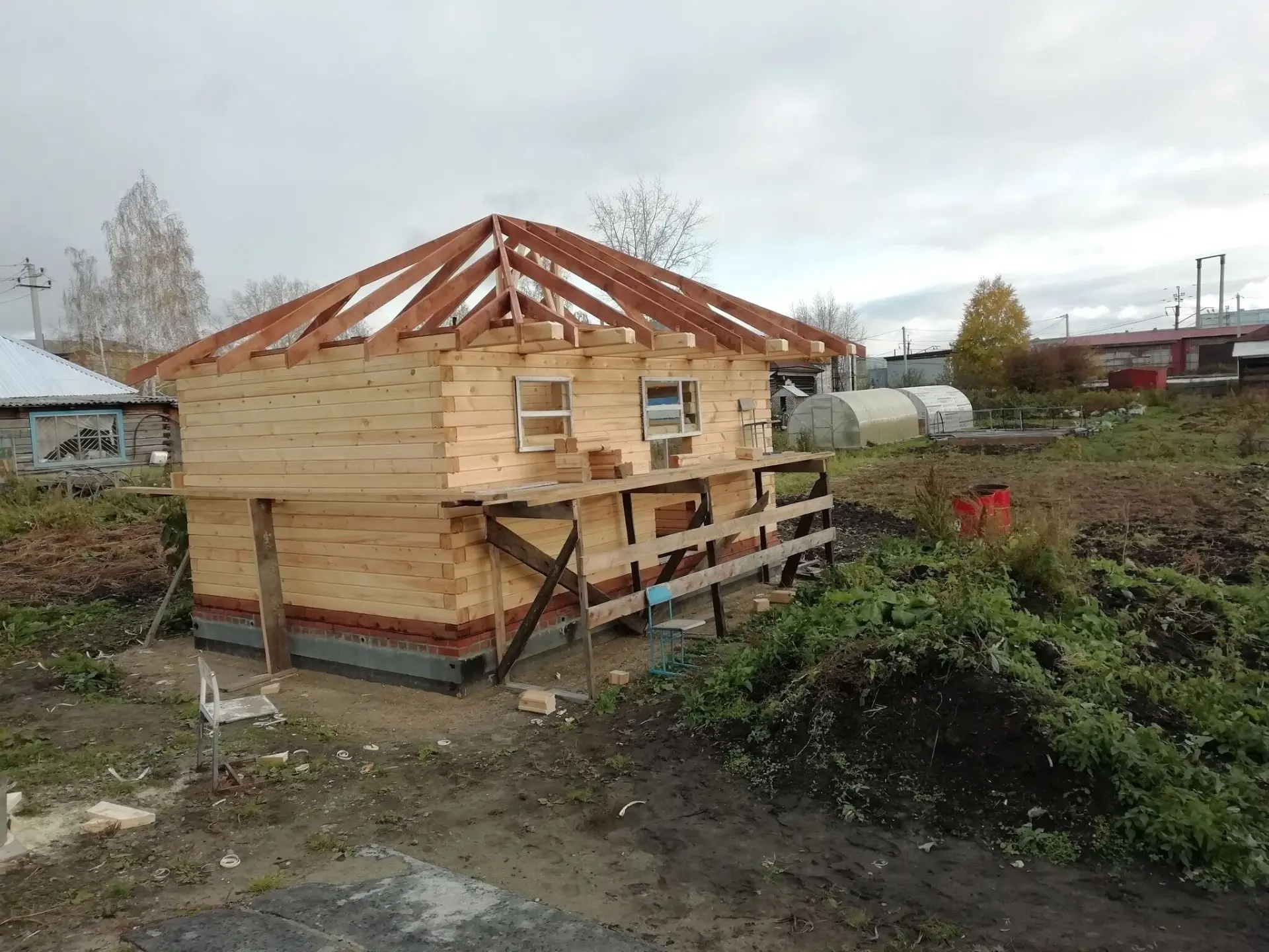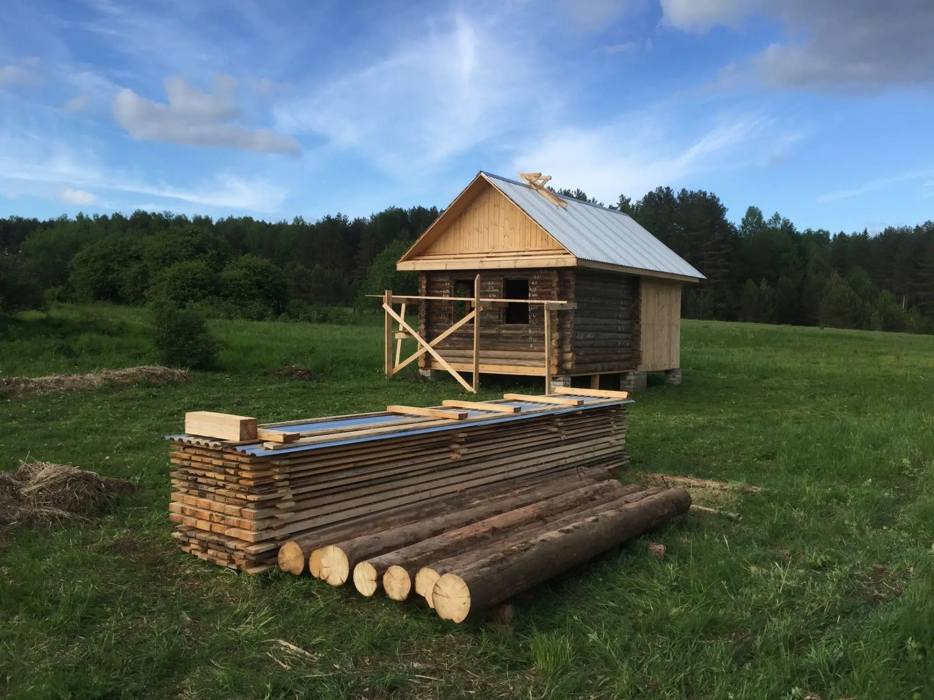 Выложили опорные столбы. Сруб решили поднять на два венца. Материал для стропил, лаг пола и каркаса пристроя обошёлся мне в 95 000 рублей, в эту же стоимость вошёл профнастил для кровли.