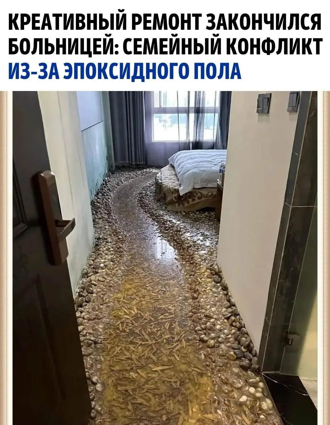 В Подмосковье обычный ремонт в квартире неожиданно превратился в семейный скандал с госпитализацией. Мужчина решил подойти к делу нестандартно и залил пол эпоксидной смолой, добавив в композицию природные элементы — камни, листья и траву. По его задумке это должно было выглядеть как оригинальный дизайнерский ход.
