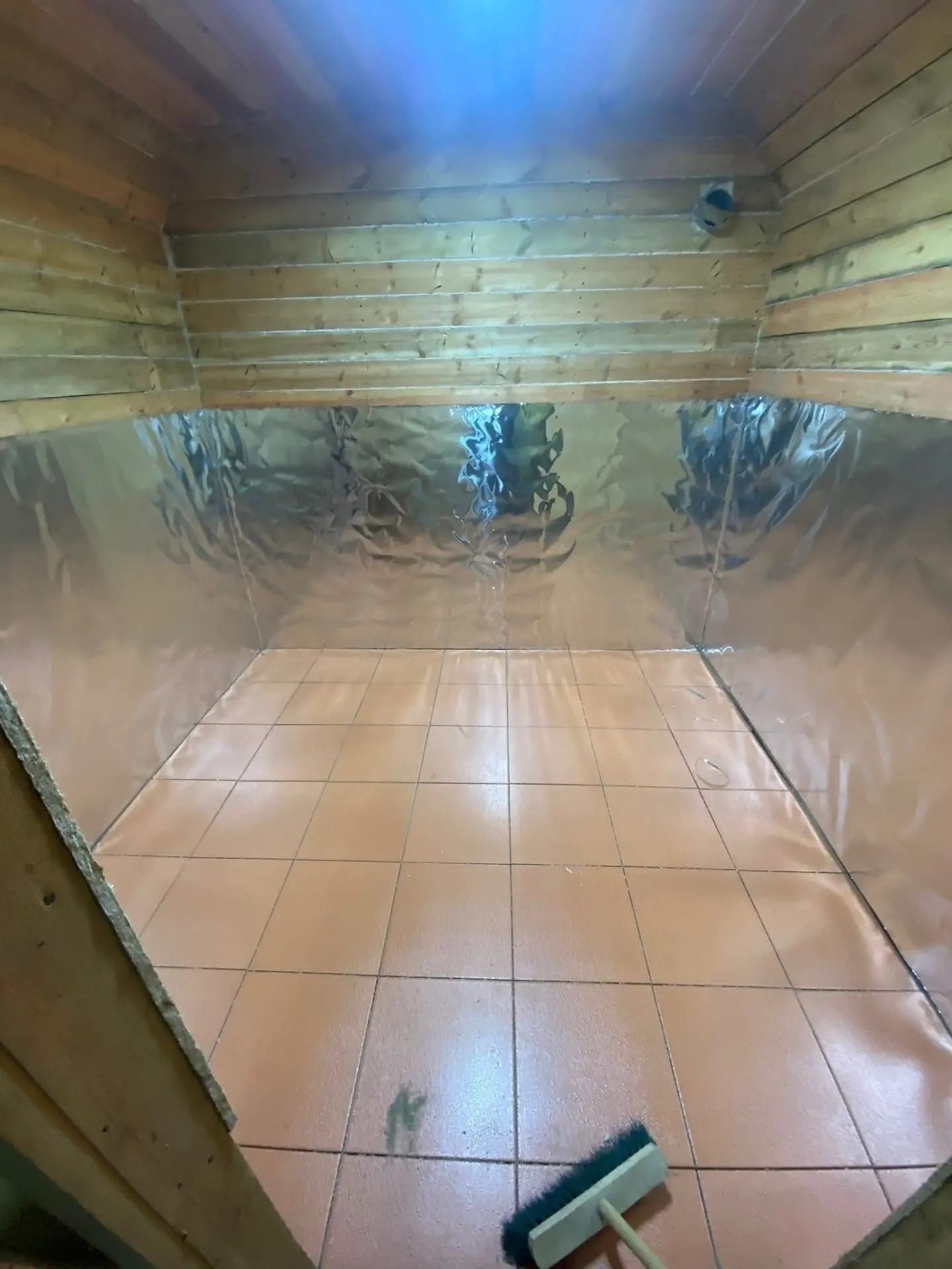 Пароизоляция и отражатель: это, наверное, самый важный момент в бане. Я использовал фольгированный отражающий материал. Я старался максимально тщательно проклеить все стыки алюминиевым скотчем, чтобы пар не проникал в утеплитель. Эта фольга не только пароизолятор, но и отличный отражатель, который не дает драгоценному теплу от печи уходить в стены.