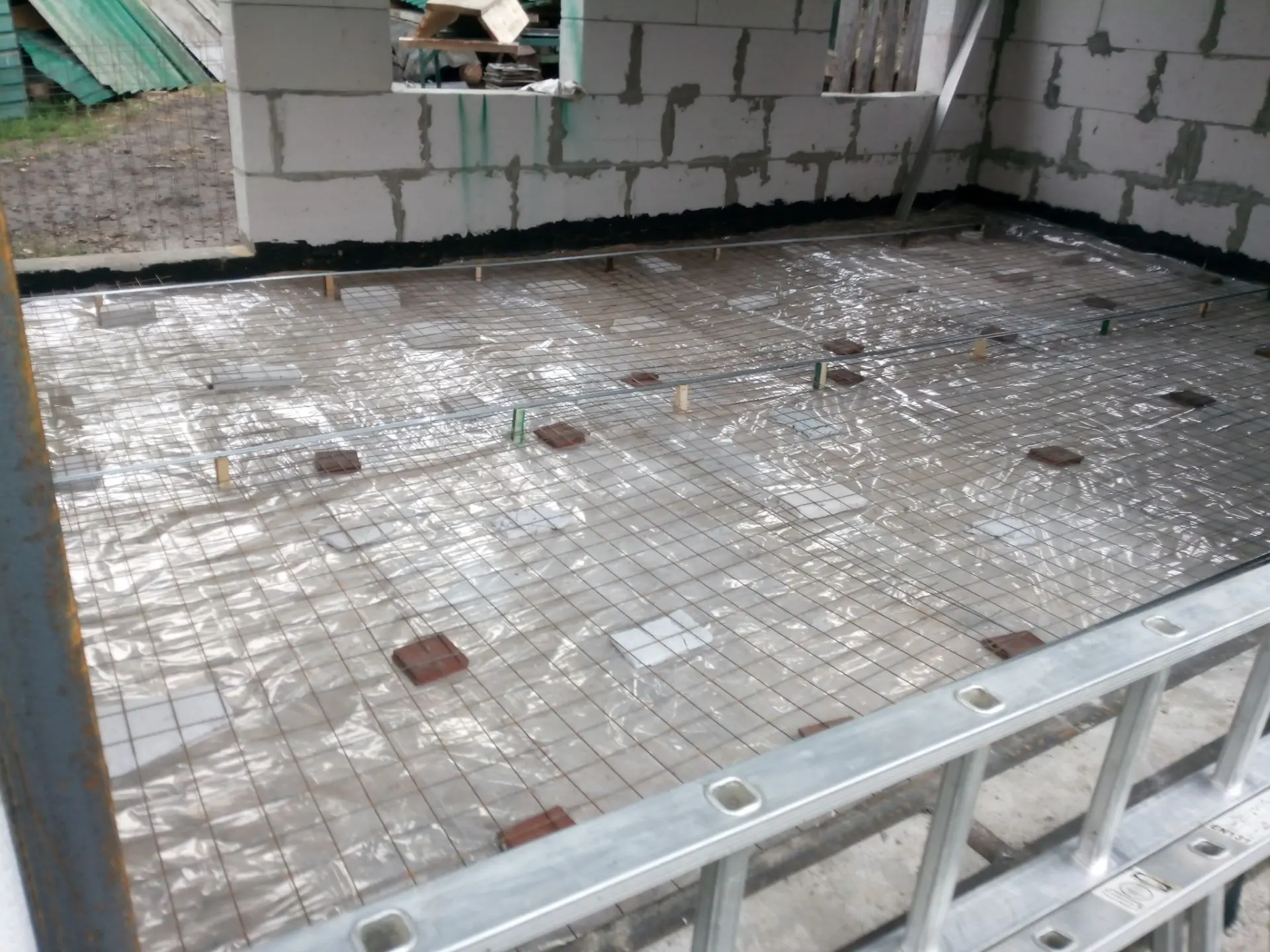 Монтажу опалубки арматуры, колоны из арматуры по углам, все это обвязал и подготовил к заливке, заказал миксер на 4,7 куба бетона. Приехал миксер, а подехать не смог, пришлось эти 4,7 куба носить вчетвером ведрами, за 2 часа управились, водитель миксера выдал: 20 лет вожу миксер, но такого ещё не видел! Ха а то!
