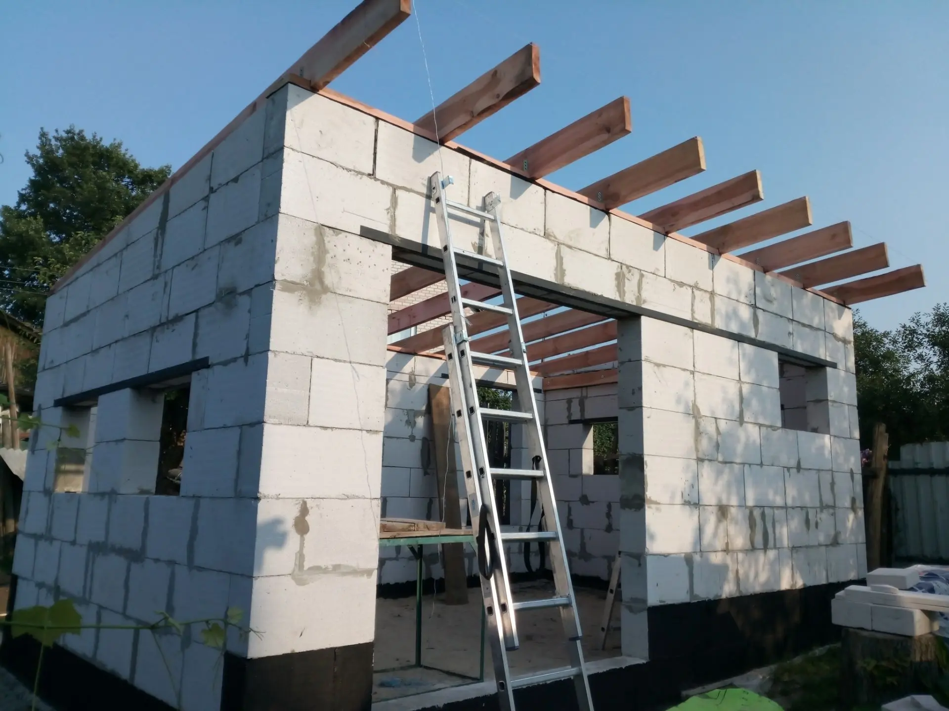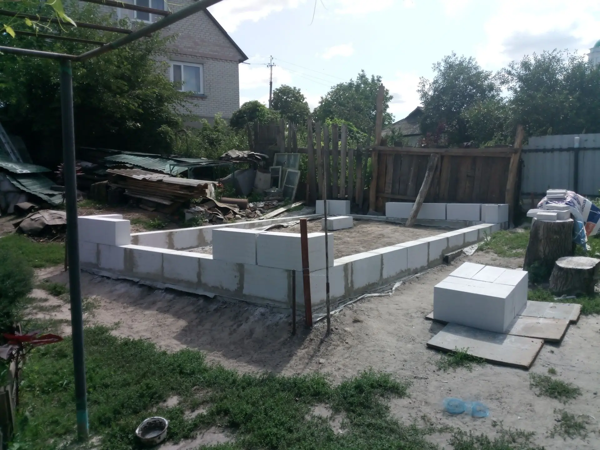 Залили. Закупил пеноблок подготовил под первый ряд основу. И понеслось... Ложил блок сам, отец на подхвате. Для перекрытия закупил брус 25×5 см и с другом разложили по местам, закрепили. Купил магической зелёной ткани (пароизоляции) расстелив скатерть. Закупил кровельный метал, взял у друга шуруповерт (мой сетевой не удобен, провода мешают) и закрепил саморезами кровлю.