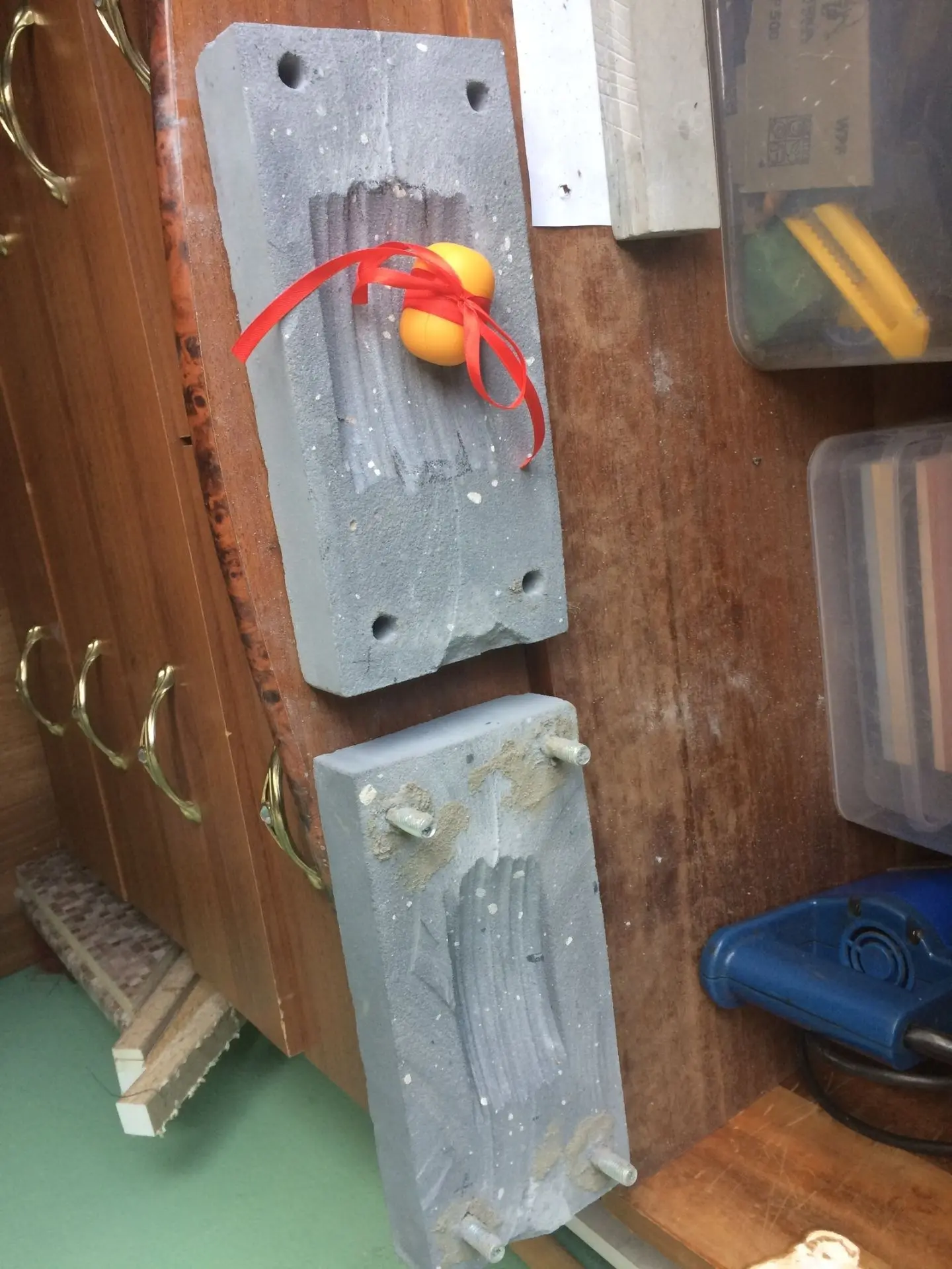 Был куплен кирпич, после чего распилен болгаркой и диском по камню пополам. В паз положил киндер с деньгами, шпильки посадил на клей для плитки.Снаружи шов замаскировал пылью от резки кирпича.