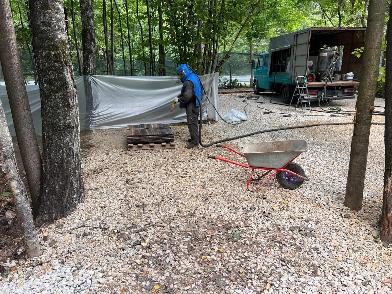Понятно что первый этап - это очистка. Поискали варианты - пескоструй значительно дешевле, плюс готовы приехать. Нашли за 25 тысяч на пол смены, выделили двух копателей в помощь, устроили небольшой загончик и всë очистили.
