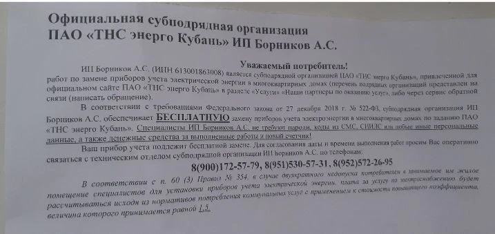 ИП Борников действительно является официальным субподрядчиком ПАО «ТНС энерго Кубань» и занимается заменой приборов учёта в многоквартирных домах.